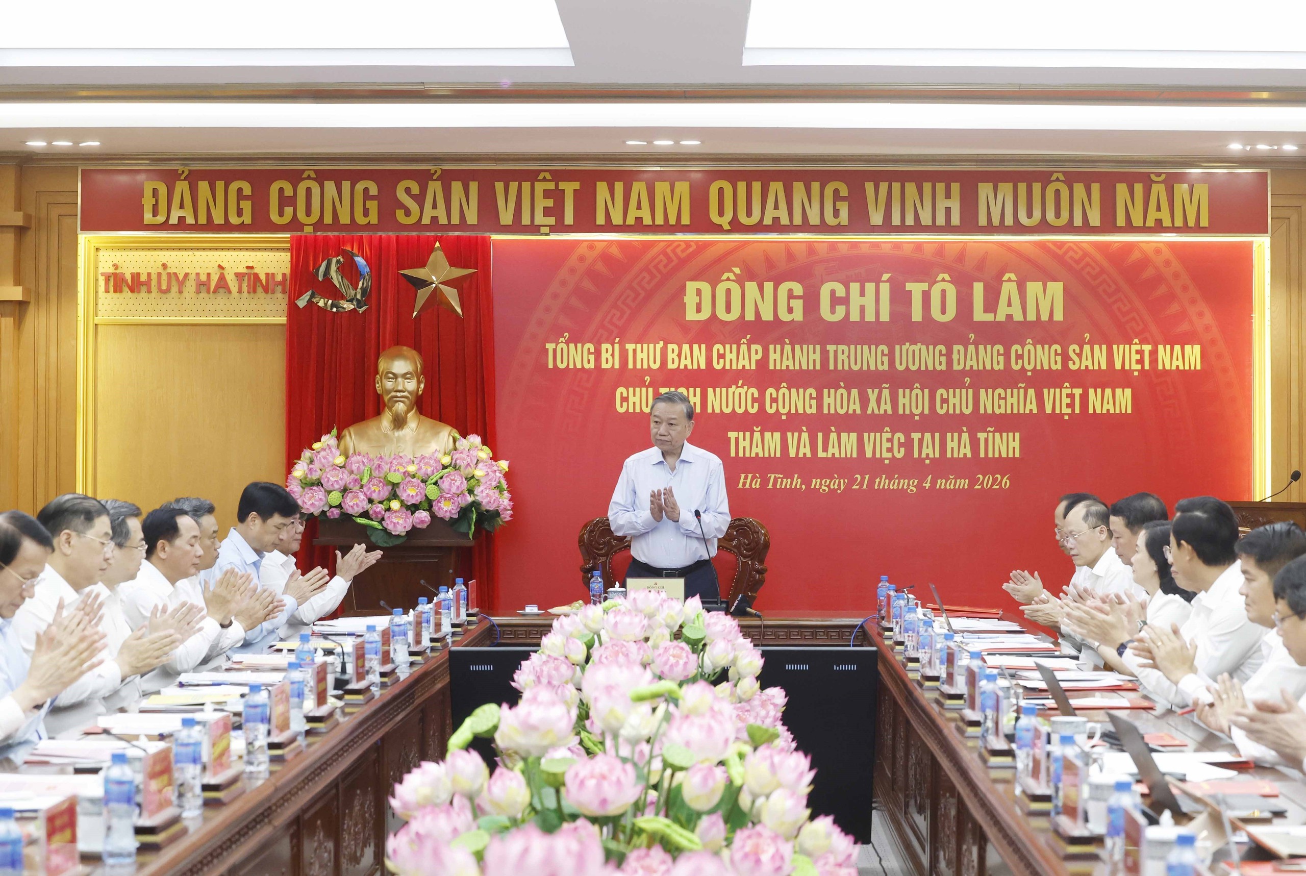 Chiều 21/4, tại Hà Tĩnh, Tổng Bí thư, Chủ tịch nước Tô Lâm và Đoàn công tác Trung ương đã làm việc với Ban Thường vụ Tỉnh ủy Hà Tĩnh về tình hình, kết quả triển khai thực hiện Nghị quyết Đại hội XIV của Đảng, Đại hội XX của Đảng bộ tỉnh; các chủ trương, nghị quyết chiến lược của Trung ương và định hướng nhiệm vụ chiến lược phát triển tỉnh Hà Tĩnh trong thời gian tới.