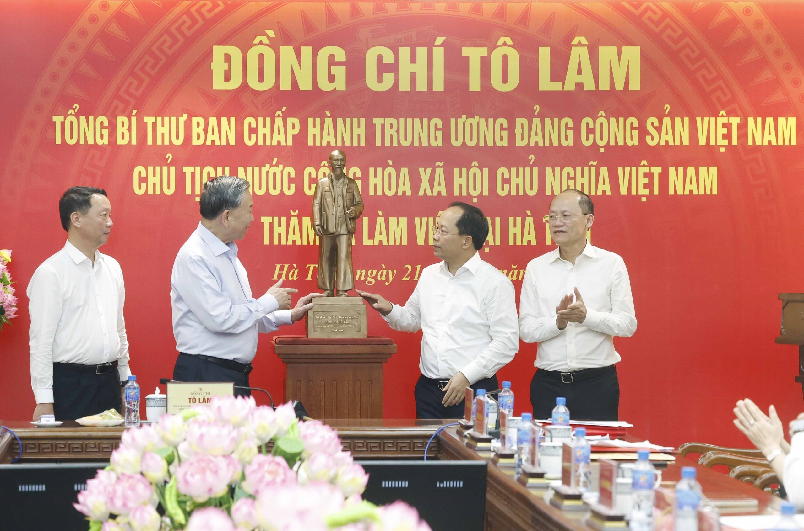 Tổng Bí thư, Chủ tịch nước Tô Lâm tặng Đảng bộ, chính quyền và nhân dân tỉnh Hà Tĩnh bức tượng Chủ tịch Hồ Chí Minh. Ảnh: Thống Nhất -TTXVN