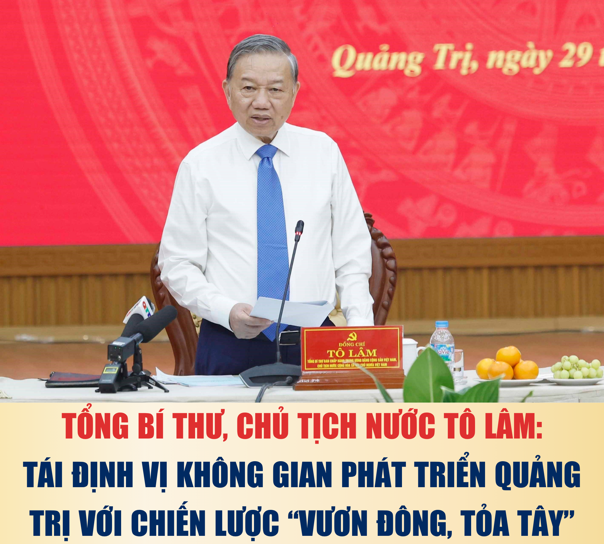 Tổng Bí thư, Chủ tịch nước yêu cầu, tái định vị không gian phát triển Quảng Trị với chiến lược "vươn Đông, tỏa Tây". "Vươn Đông" là lấy hướng biển làm trung tâm mở rộng của nền kinh tế, là hướng phát triển chủ đạo; thông qua hành lang kinh tế Đông - Tây. Tích hợp các phương thức vận tải và logistics để đưa các chức năng của kinh tế biển lan tỏa lên phía Tây và mở rộng sang các vùng, lãnh thổ khác. Theo đó, trục Đông - Tây trở thành trục tổ chức lại không gian sản xuất, logistics, đô thị, liên kết vùng, kết nối chiến lược với Lào, Thái Lan, Myanmar và tiểu vùng Mekong; gắn Lao Bảo, La Lay, cửa khẩu, cảng biển, khu kinh tế, thương mại biên giới thành một hệ sinh thái thống nhất. Trục Bắc – Nam, là cột sống tích hợp, kết nối sức mạnh của quốc gia.