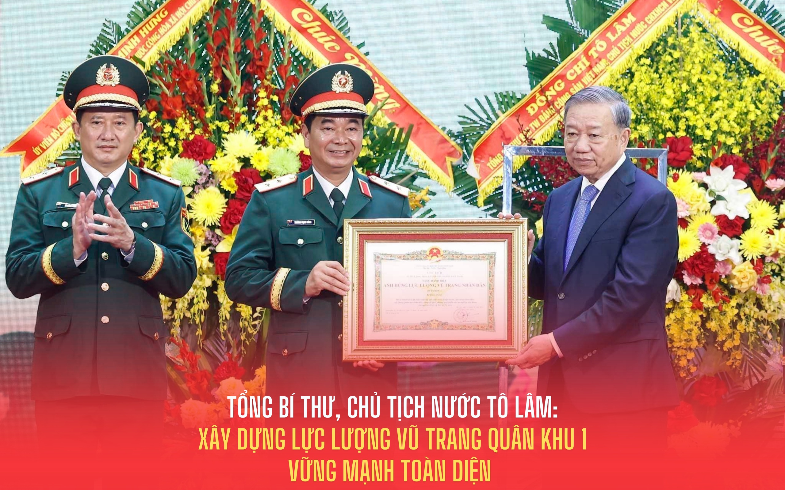Với những chiến công và thành tích đặc biệt xuất sắc trong hơn 80 năm qua, Lực lượng vũ trang Quân khu 1 đã vinh dự được Đảng, Nhà nước trao tặng nhiều phần thưởng cao quý. Thay mặt lãnh đạo Đảng, Nhà nước, Quân ủy Trung ương, Tổng Bí thư, Chủ tịch nước Tô Lâm nhiệt liệt chúc mừng và biểu dương những chiến công, thành tích đặc biệt xuất sắc của Lực lượng vũ trang Quân khu 1 trong hơn 80 năm qua.