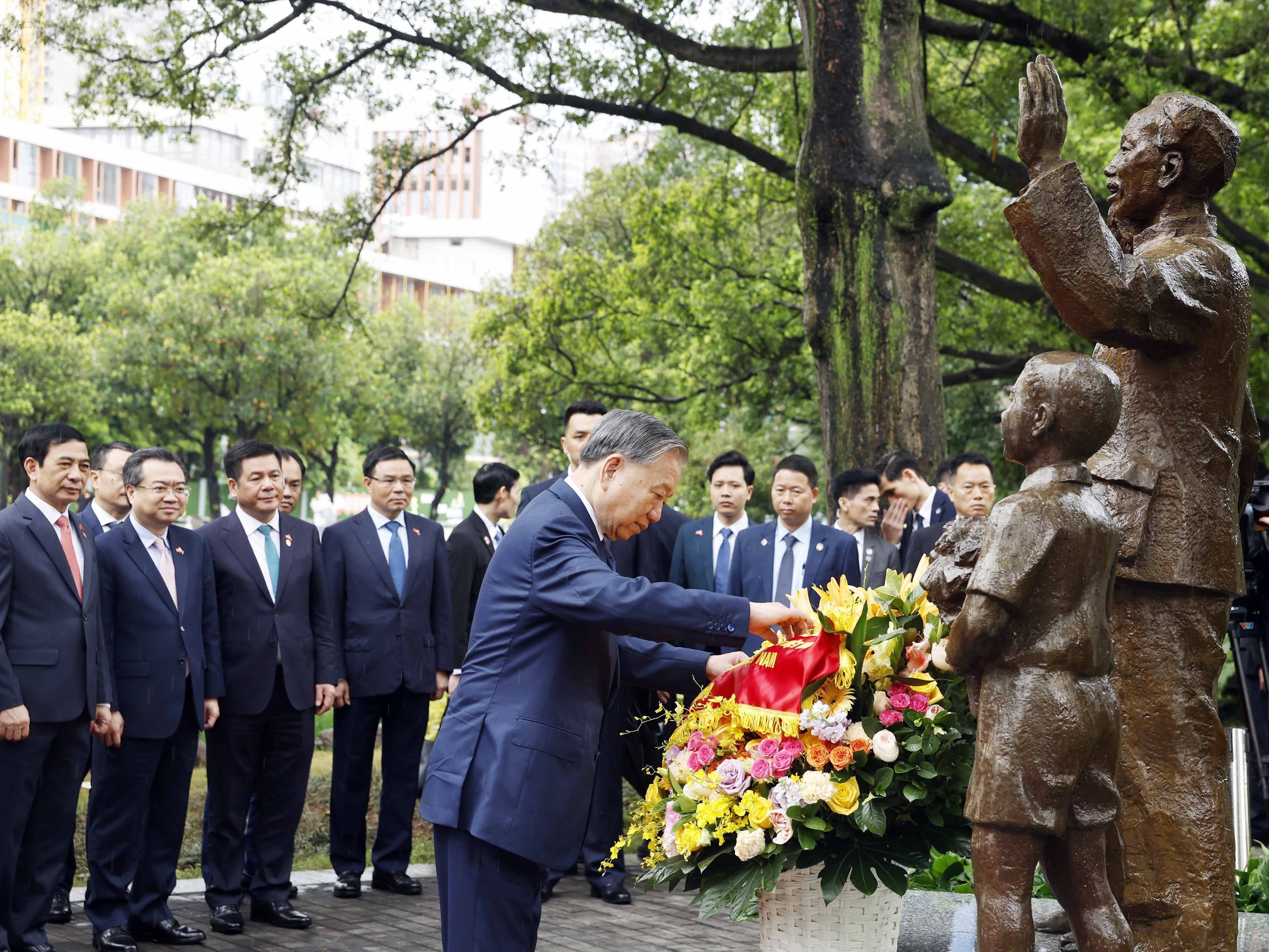 Tổng Bí thư, Chủ tịch nước Tô Lâm và Phu nhân cùng các đại biểu dâng hoa tưởng niệm tại tượng Bác Hồ trong khuôn viên Di tích Khu học xá Trung ương (Nam Ninh, Trung Quốc). Ảnh: Thống Nhất - TTXVN