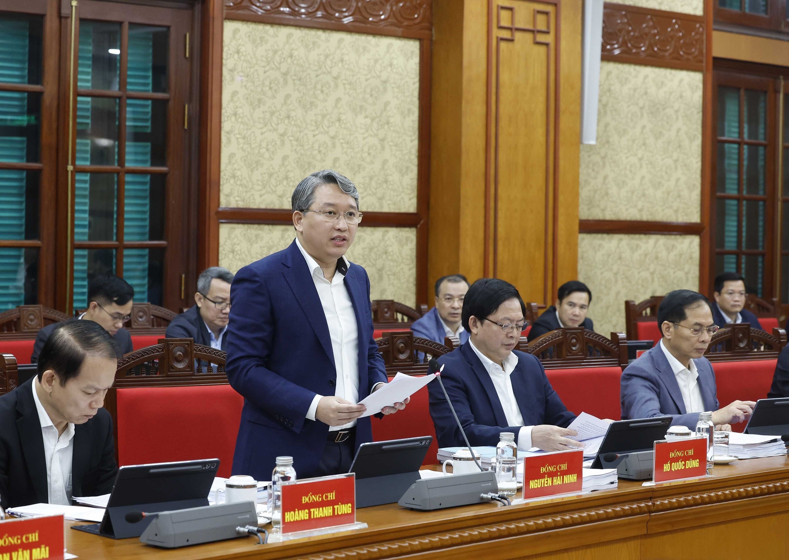 Đồng chí Nguyễn Hải Ninh, Ủy viên Trung ương Đảng, Bộ trưởng Bộ Tư pháp, Ủy viên Thường trực Ban Chỉ đạo Trung ương về hoàn thiện thể chế, pháp luật trình bày báo cáo. Ảnh: Thống Nhất – TTXVN
