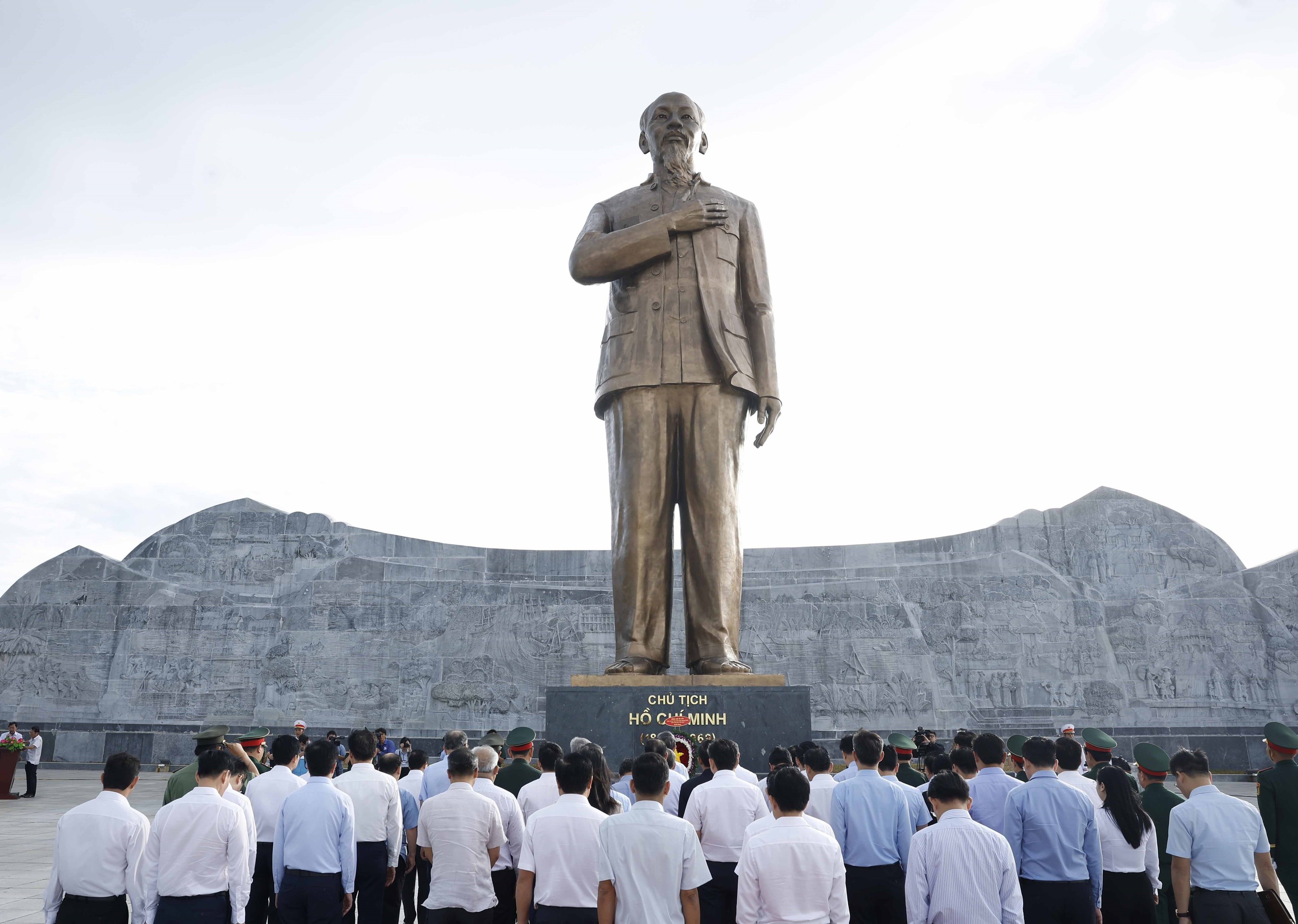Tổng Bí thư Tô Lâm và đoàn công tác Trung ương dâng hoa, dâng hương trước Tượng đài Chủ tịch Hồ Chí Minh tại Quảng trường Hồ Chí Minh. Ảnh: Thống Nhất – TTXVN