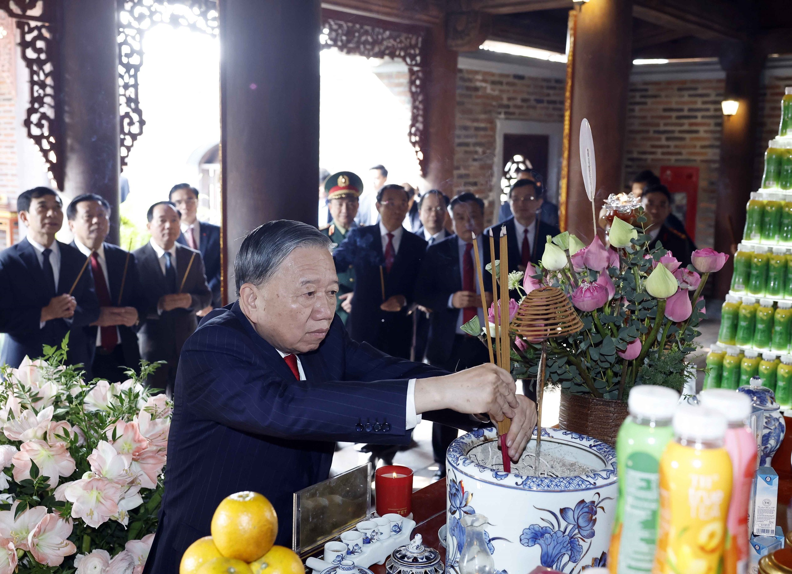 Tổng Bí thư Tô Lâm dâng hương tại Đền Chung Sơn thờ gia tiên Bác Hồ. Ảnh: Thống Nhất - TTXVN