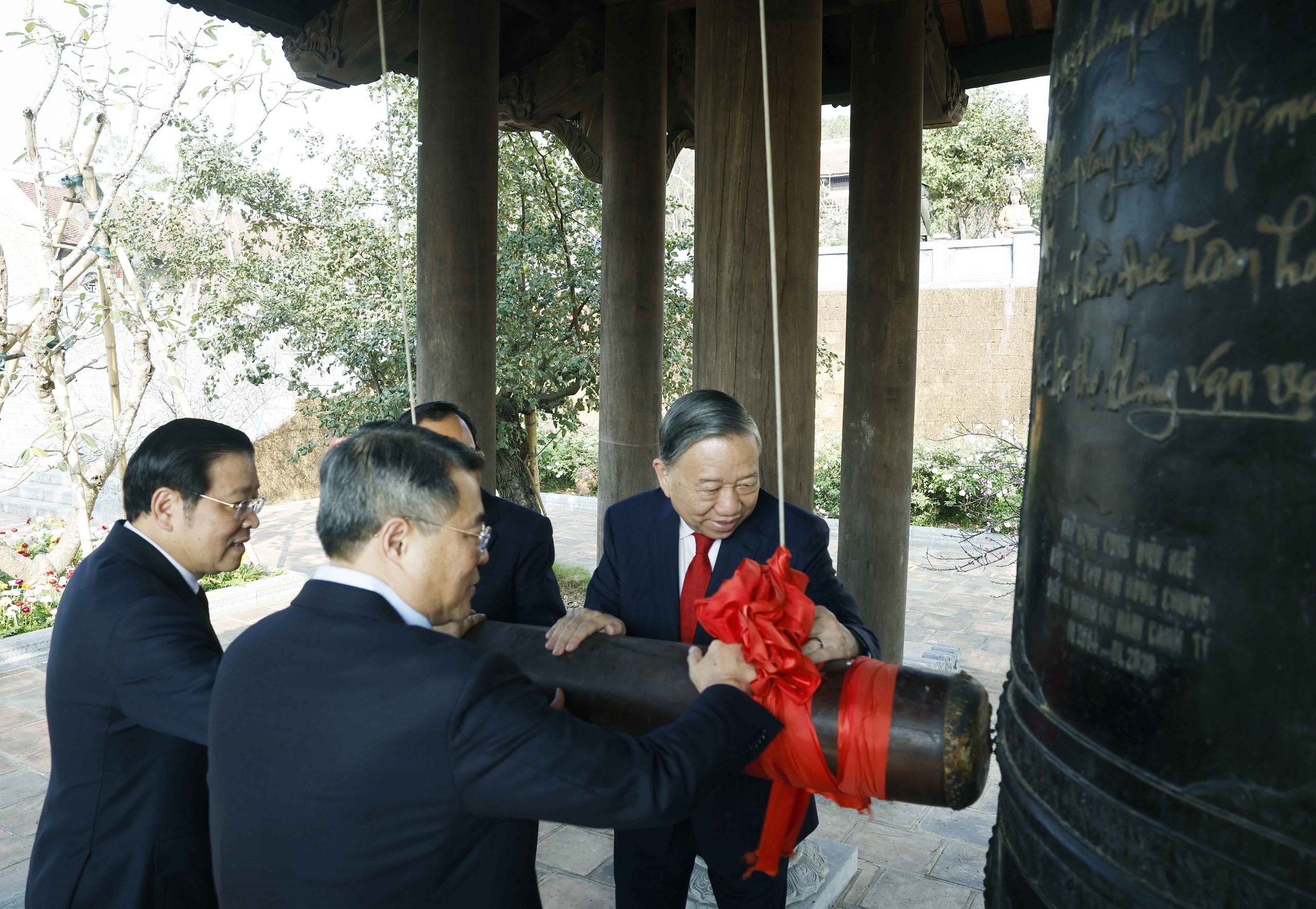 Tổng Bí thư Tô Lâm và các đại biểu thỉnh chuông tại Đền Chung Sơn. Ảnh: Thống Nhất - TTXVN