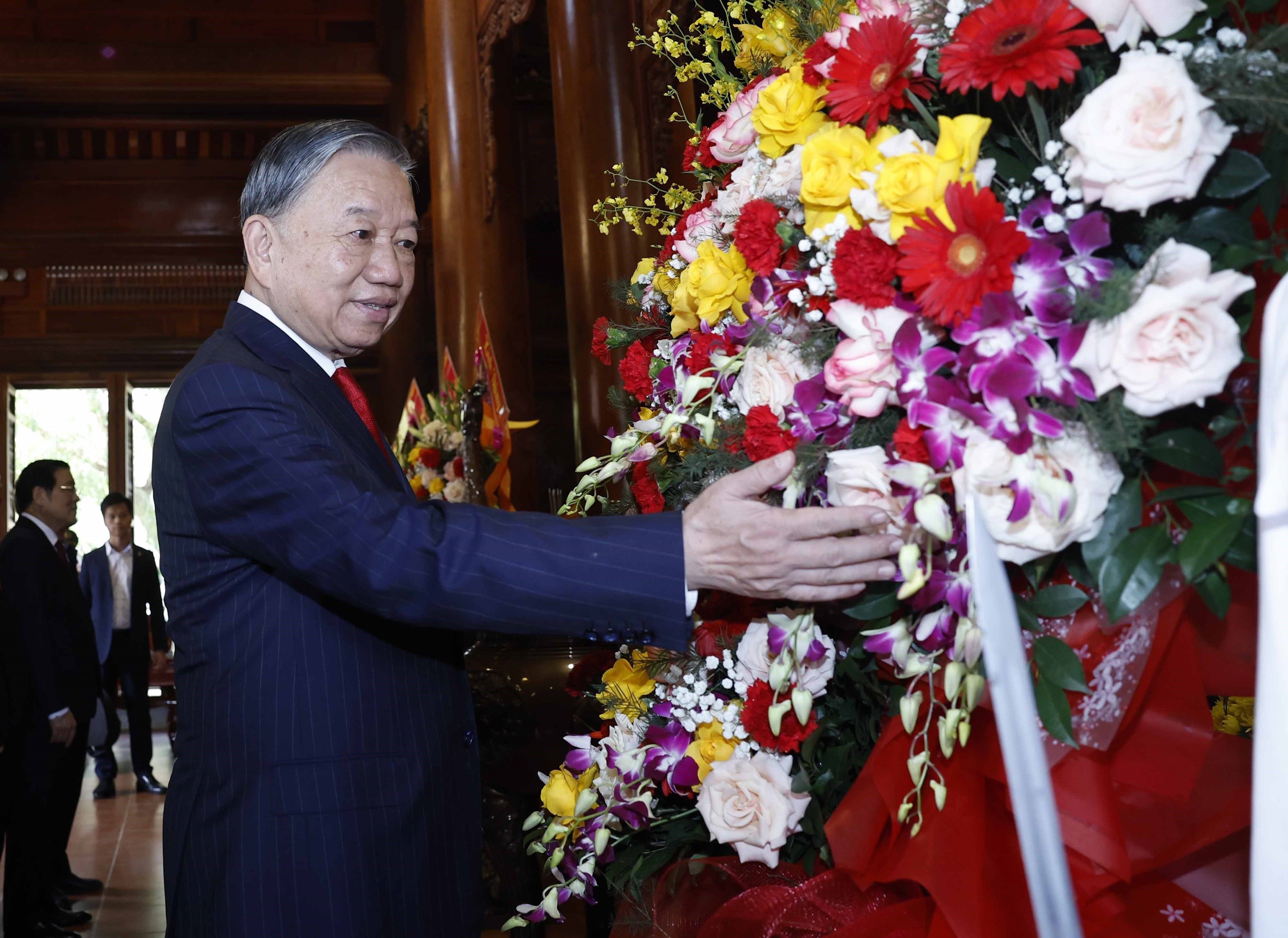 Tổng Bí thư Tô Lâm dâng hoa tại Khu Di tích quốc gia đặc biệt Kim Liên. Ảnh: Thống Nhất - TTXVN