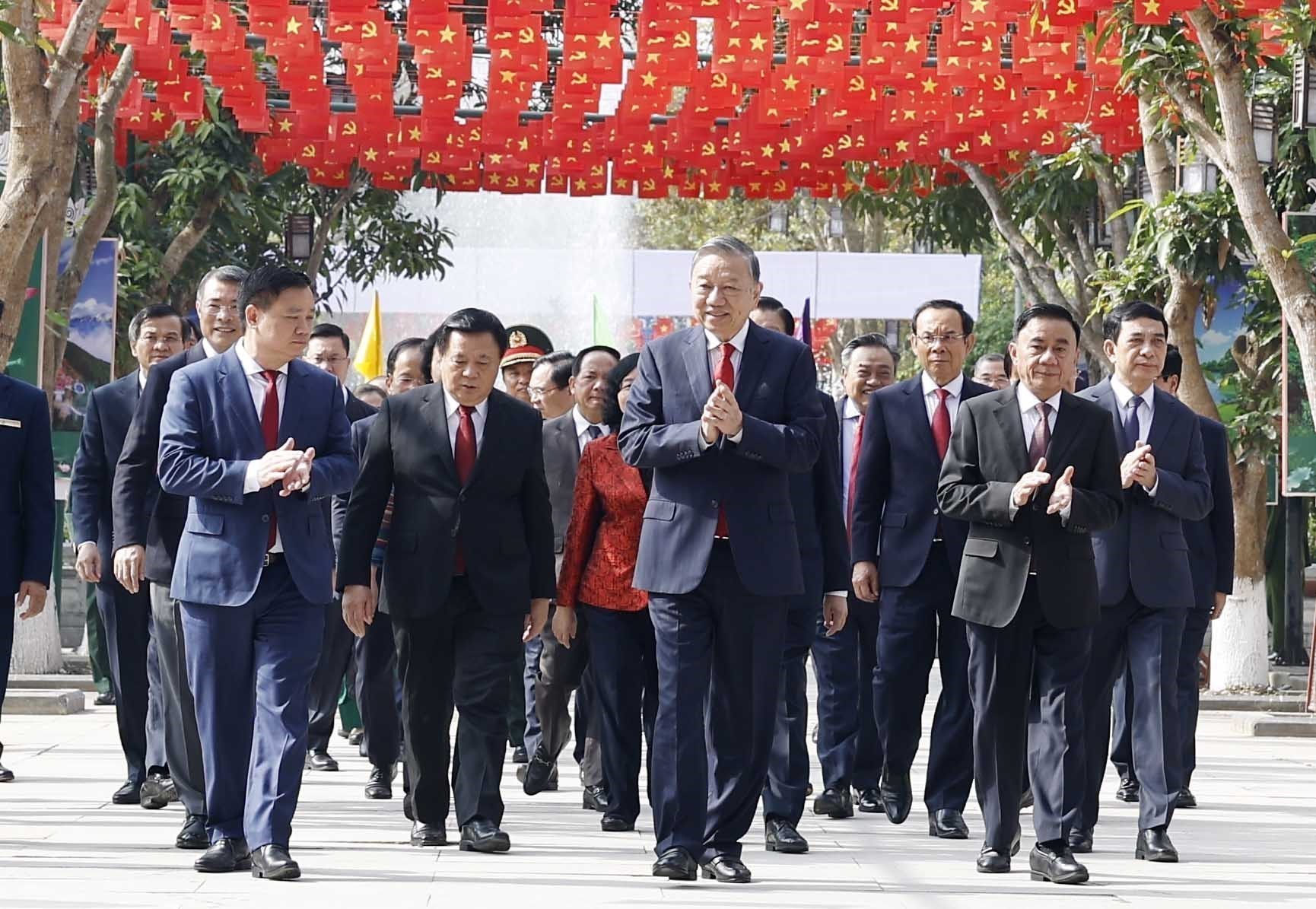 Tổng Bí thư Tô Lâm và đại biểu tại Khu Di tích quốc gia đặc biệt Kim Liên, tỉnh Nghệ An. Ảnh: Thống Nhất - TTXVN
