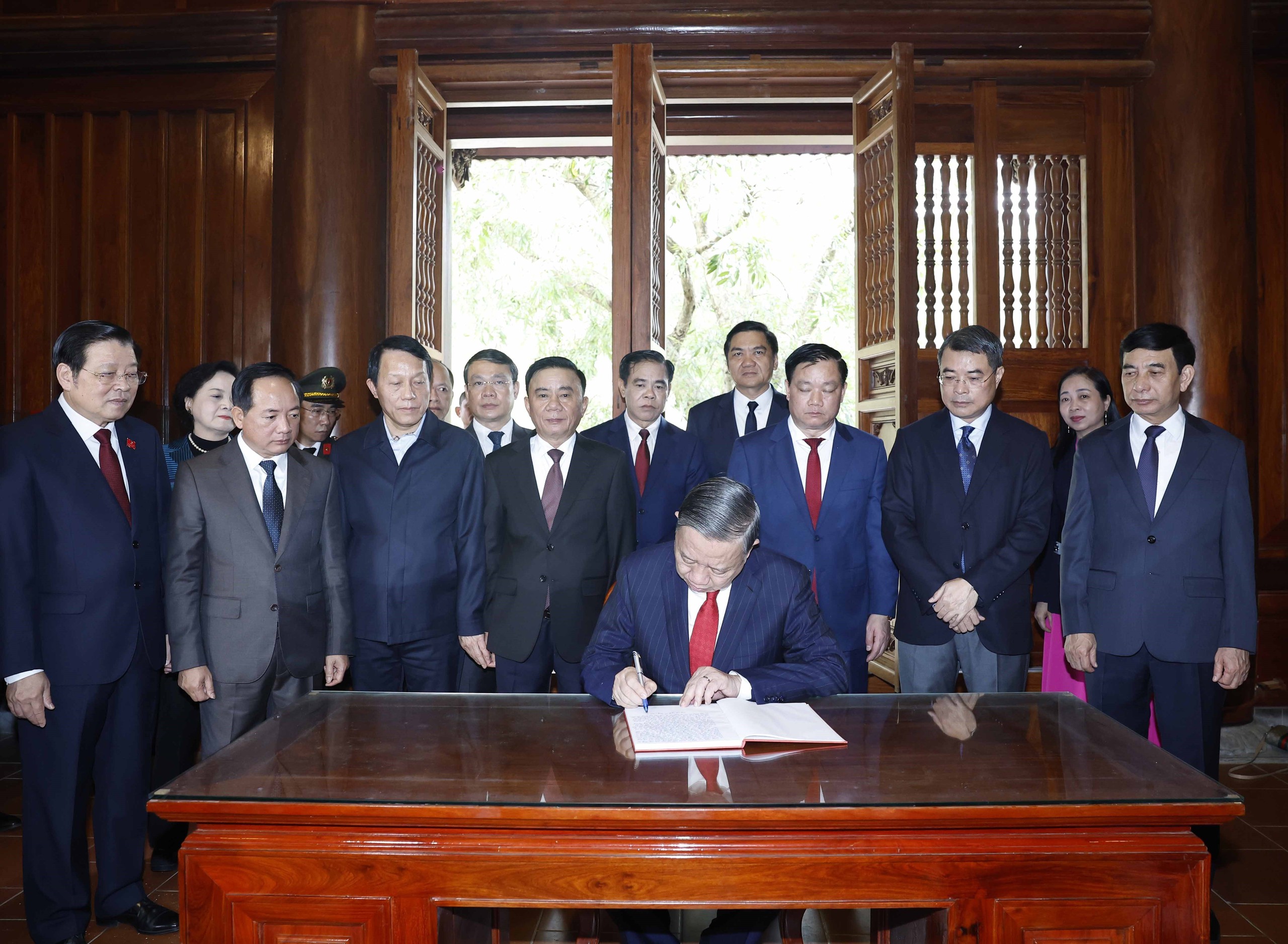 Tổng Bí thư Tô Lâm ghi sổ lưu bút tại Khu Di tích quốc gia đặc biệt Kim Liên. Ảnh: Thống Nhất - TTXVN
