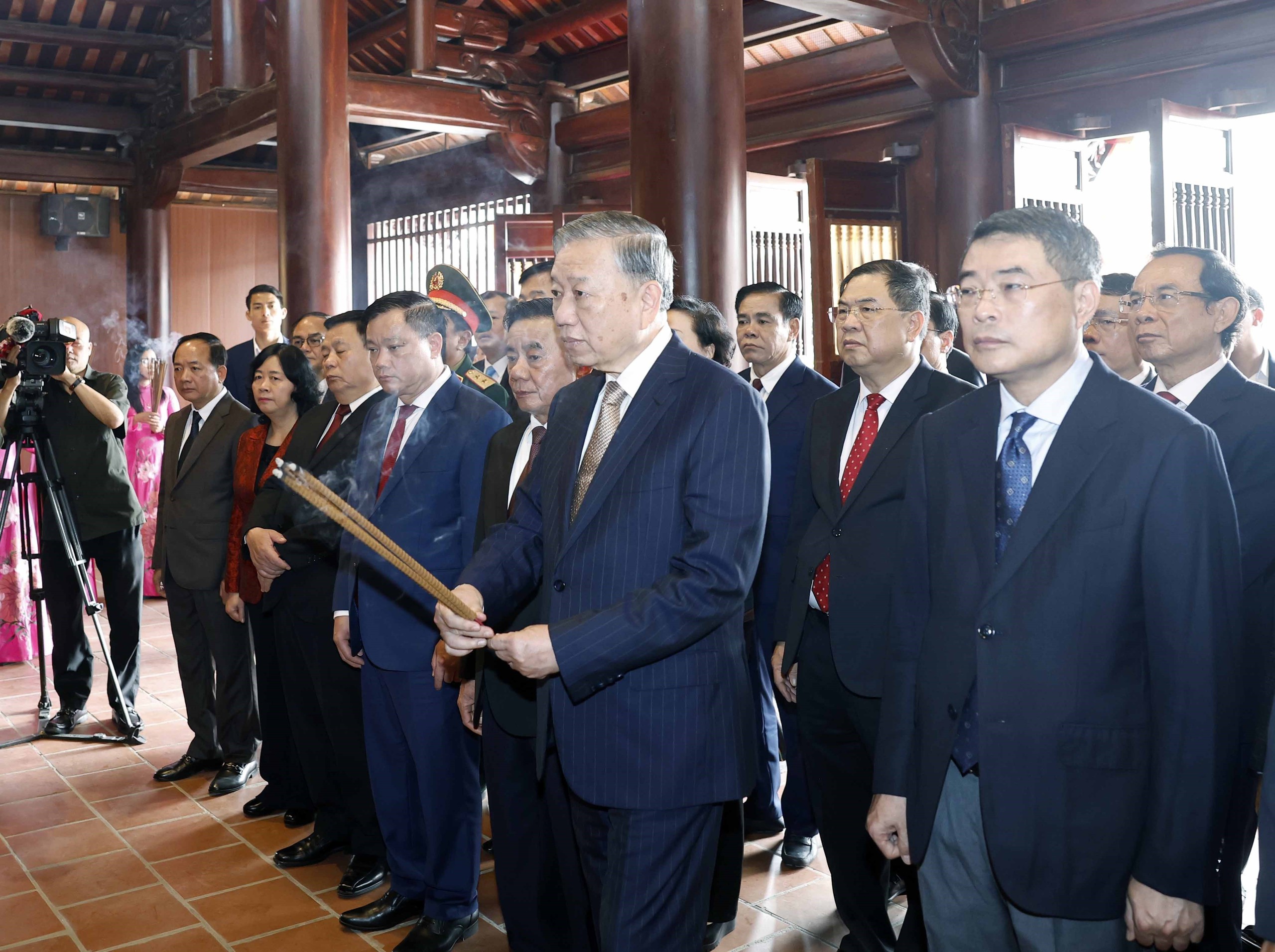 Tổng Bí thư Tô Lâm cùng Đoàn công tác dâng hương tưởng niệm Chủ tịch Hồ Chí Minh tại Khu Di tích quốc gia đặc biệt Kim Liên. Ảnh: Thống Nhất - TTXVN