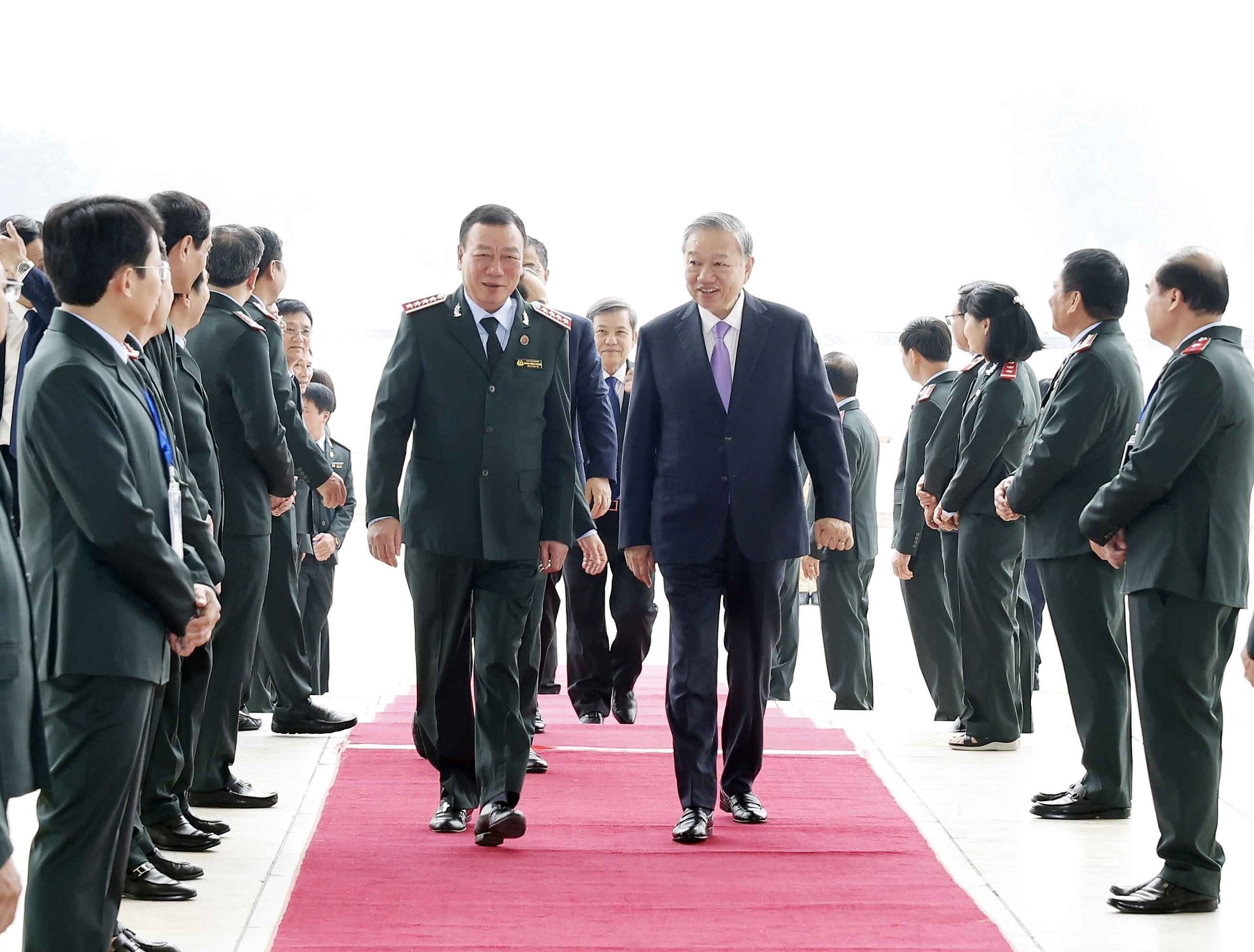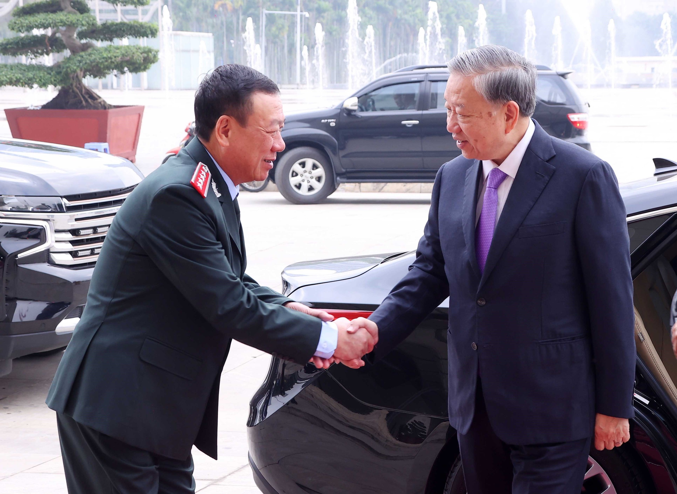 Tổng Thanh tra Chính phủ Đoàn Hồng Phong đón Tổng Bí thư Tô Lâm đến dự Lễ kỷ niệm 80 năm Ngày truyền thống Thanh tra Việt Nam. Ảnh: Văn Điệp - TTXVN