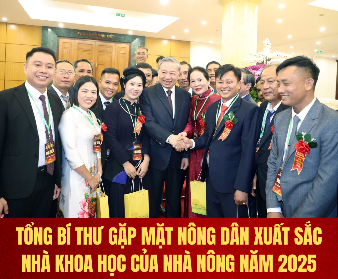 Tại buổi gặp mặt, Tổng Bí thư Tô Lâm chúc mừng toàn thể cán bộ, hội viên Hội Nông dân Việt Nam nhân kỷ niệm 95 năm Ngày thành lập Hội và chúc mừng, khen ngợi 95 Nông dân xuất sắc và Nhà khoa học của nhà nông năm 2025.