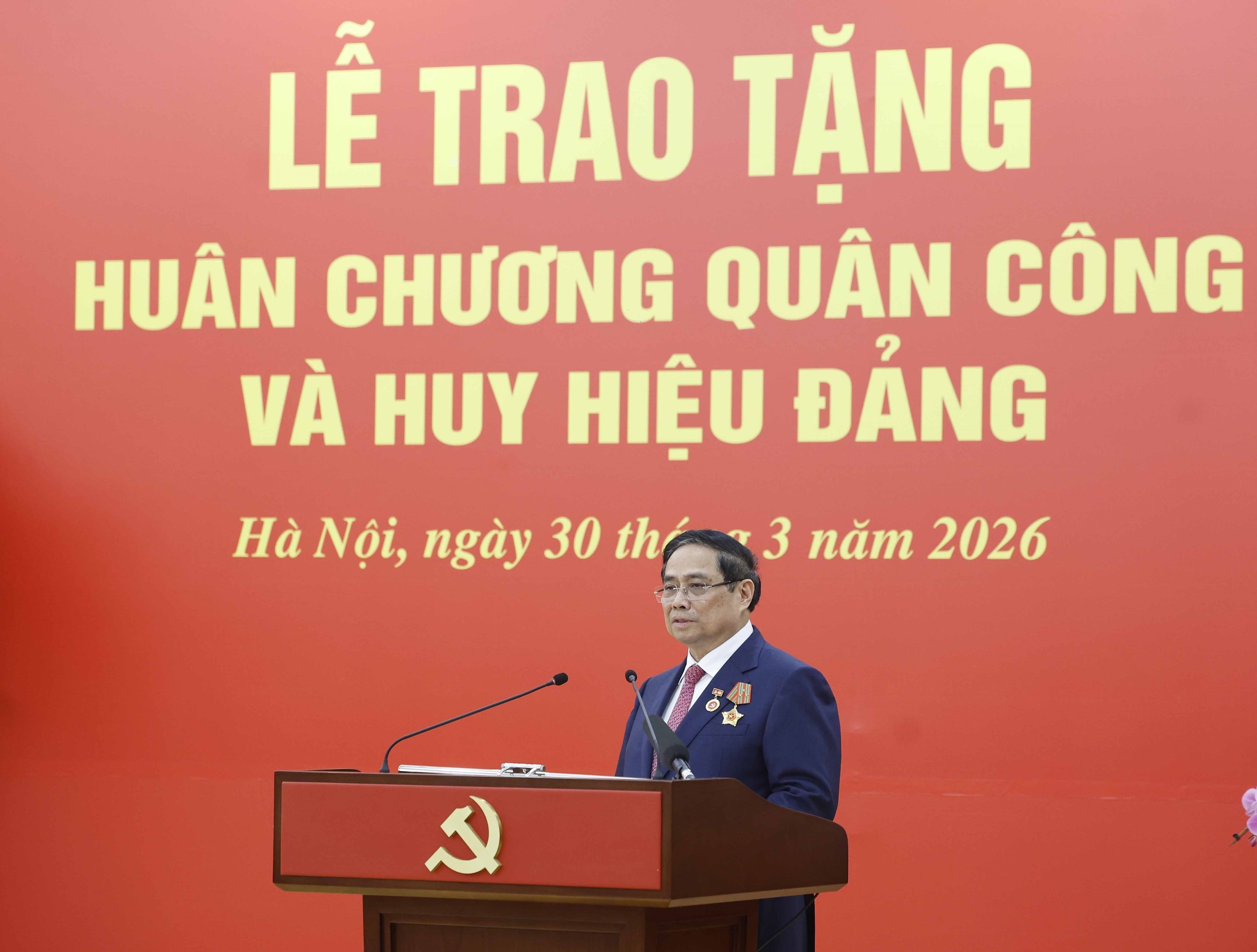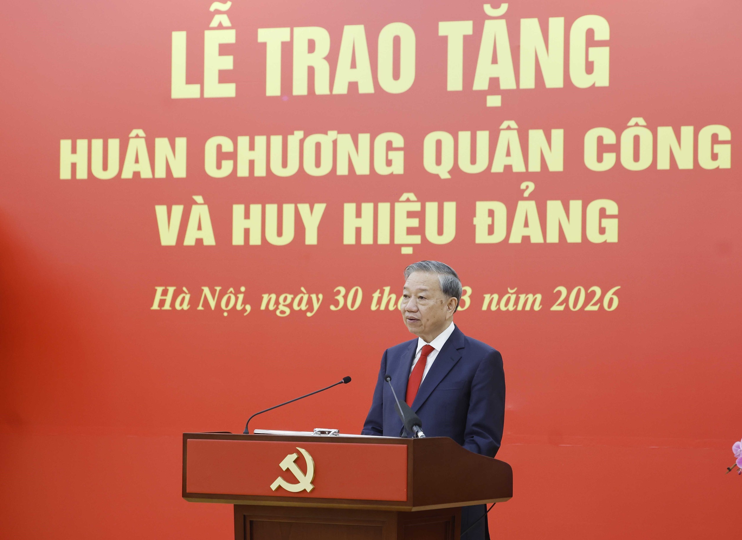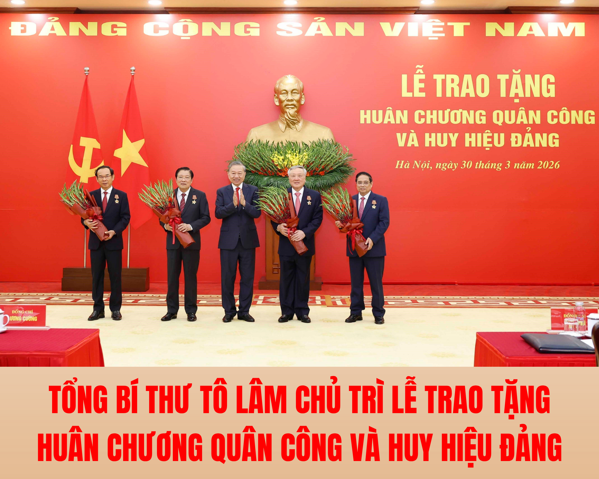 Chiều 30/3/2026, tại Trụ sở Trung ương Đảng, Tổng Bí thư Tô Lâm chủ trì Lễ trao tặng Huân chương Quân công và Huy hiệu 30 năm, 40 năm, 45 năm tuổi Đảng cho các đồng chí lãnh đạo cấp cao của Đảng, Nhà nước và Chính phủ.