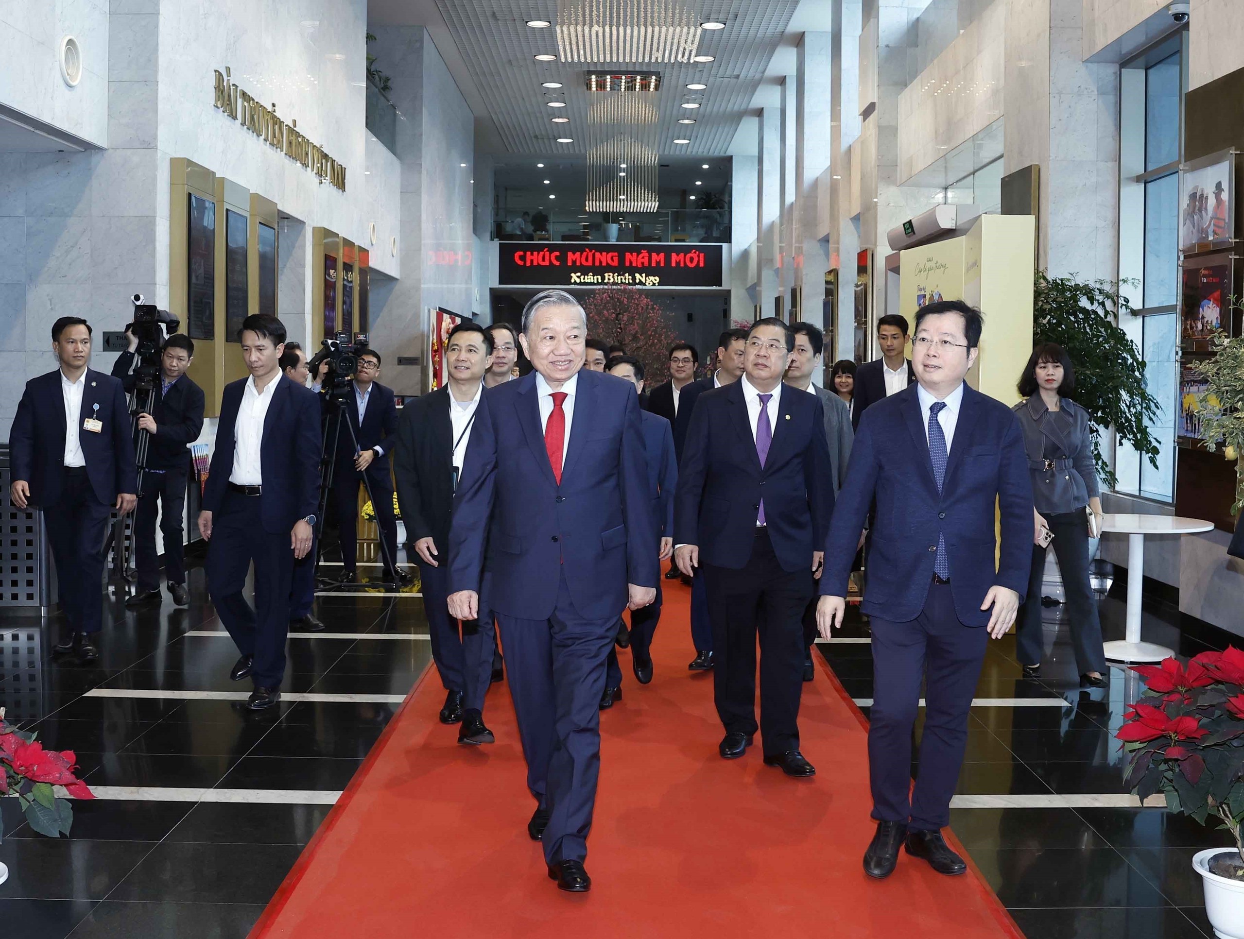 Tổng Bí thư Tô Lâm tới thăm, chúc Tết cán bộ, phóng viên, biên tập viên, kỹ thuật viên và người lao động Đài Truyền hình Việt Nam. Ảnh: Thống Nhất-TTXVN