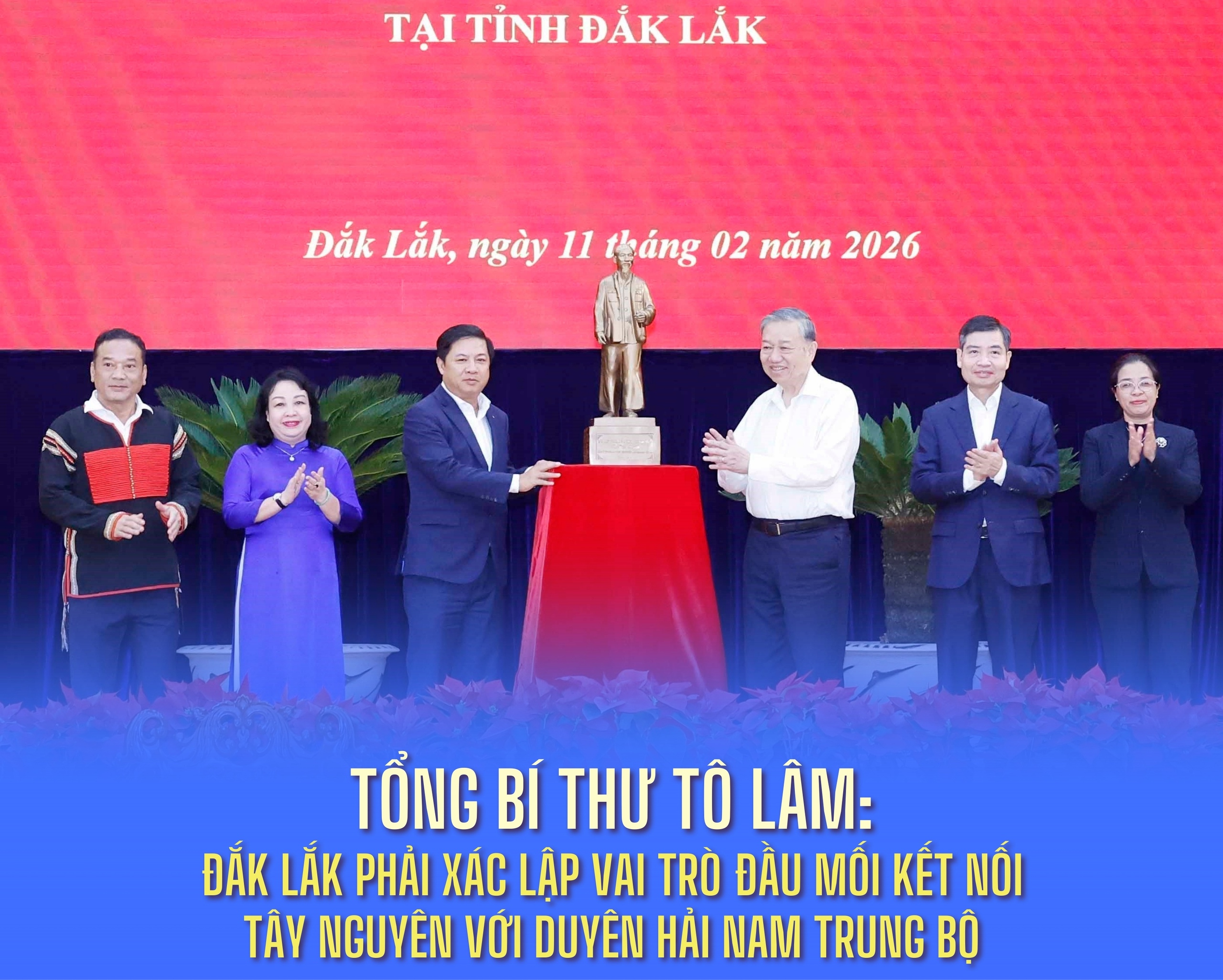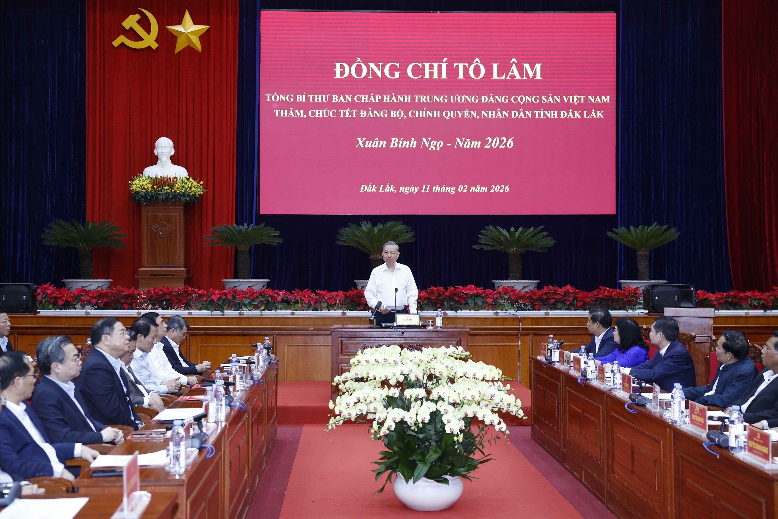Phát biểu với Đảng bộ, chính quyền, nhân dân tỉnh Đắk Lắk, Tổng Bí thư Tô Lâm ghi nhận, những kết quả đạt được trong năm 2025 cho thấy bản lĩnh, sự nỗ lực rất lớn và tinh thần trách nhiệm cao của Đảng bộ, chính quyền và nhân dân tỉnh Đắk Lắk; tin tưởng một vùng đất giàu truyền thống cách mạng, có chiều sâu văn hóa và cộng đồng các dân tộc đoàn kết, Đắk Lắk bước vào năm 2026 với khí thế, quyết tâm rất cao cho một nhiệm kỳ mới.