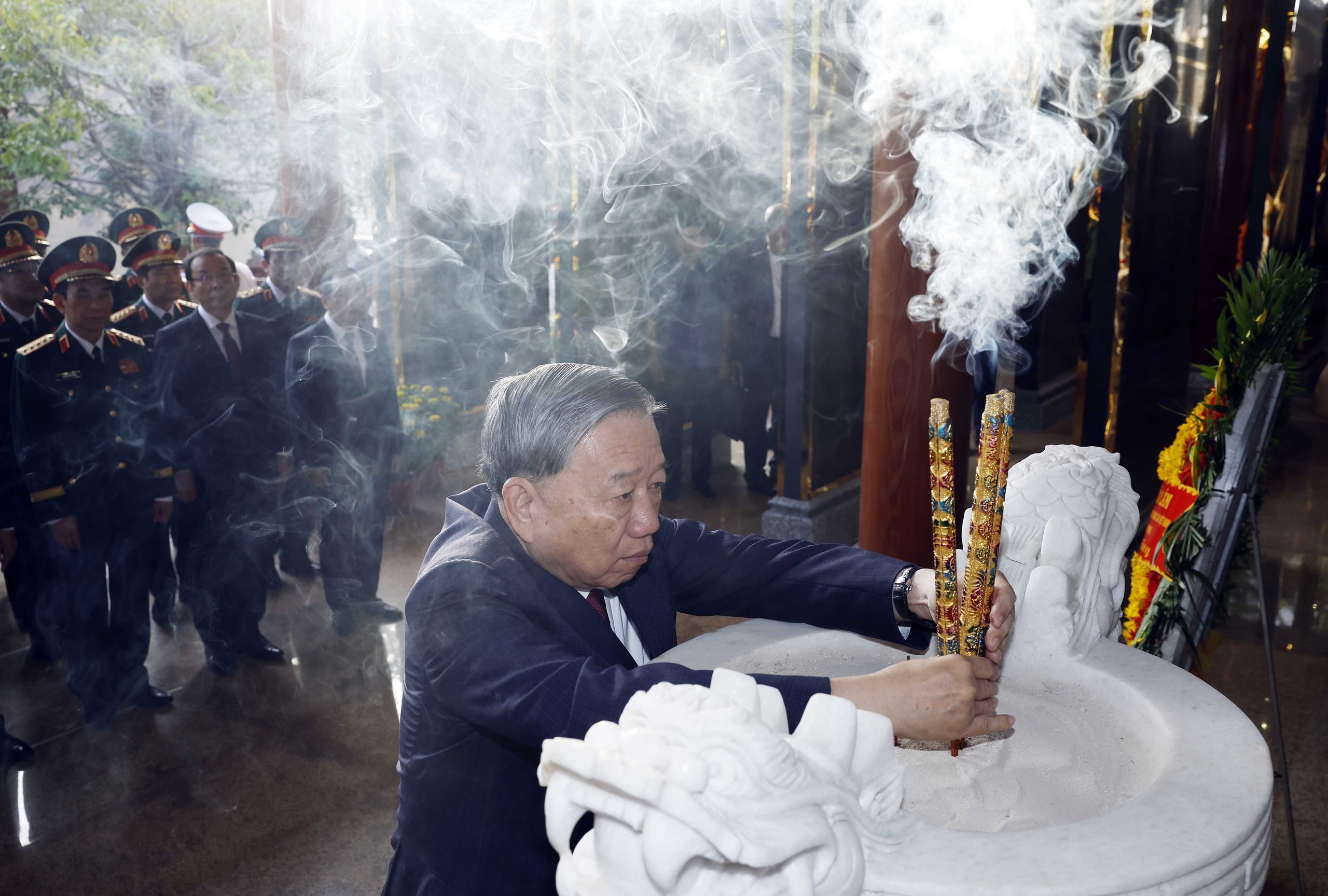 Tổng Bí thư Tô Lâm và các đại biểu dâng hoa, dâng hương tại Nhà bia tưởng niệm các Anh hùng liệt sĩ. Ảnh: Thống Nhất – TTXVN