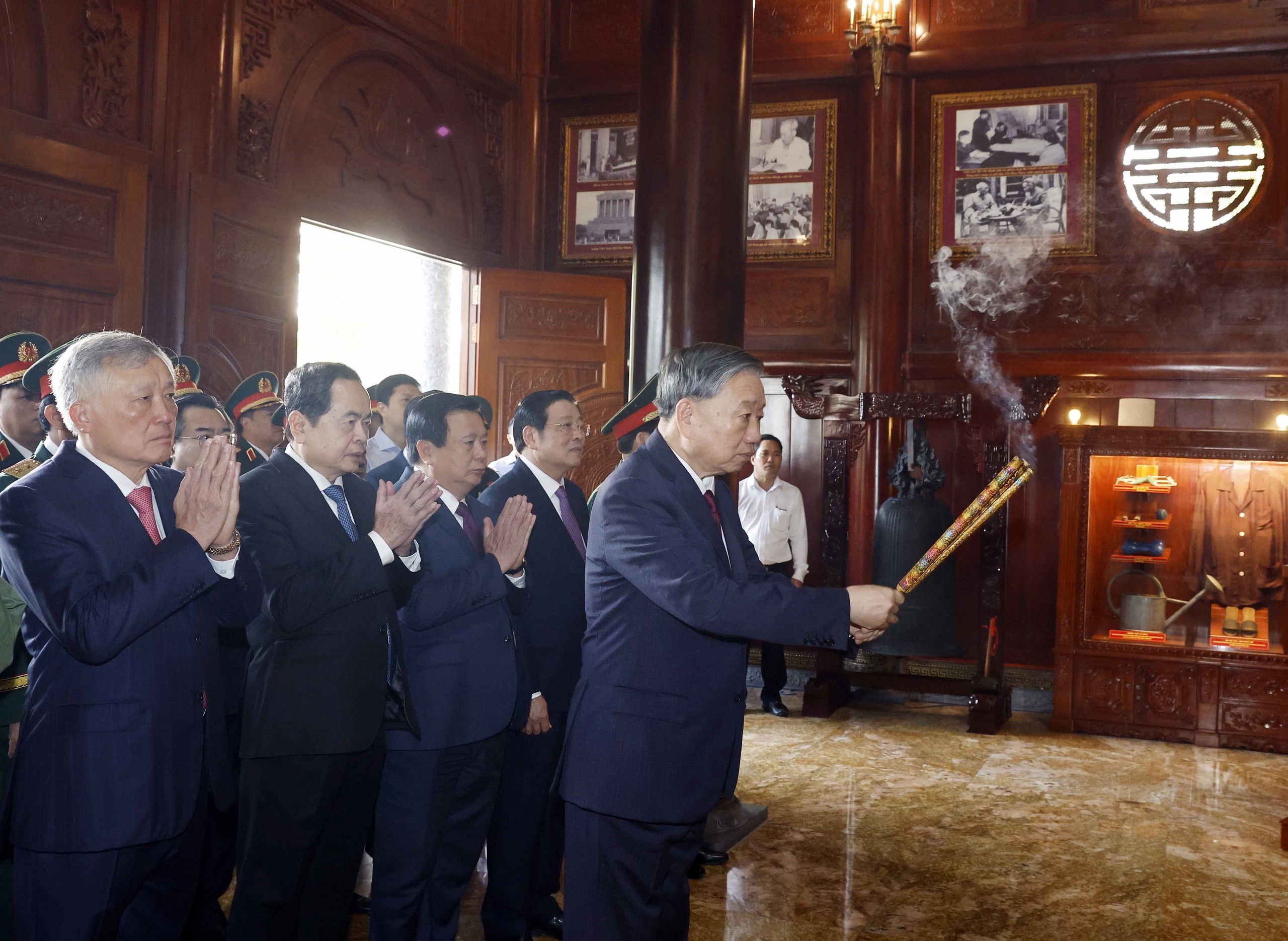 Tổng Bí thư Tô Lâm và các đại biểu dâng hoa, dâng hương tại Nhà tưởng niệm Chủ tịch Hồ Chí Minh. Ảnh: Thống Nhất – TTXVN