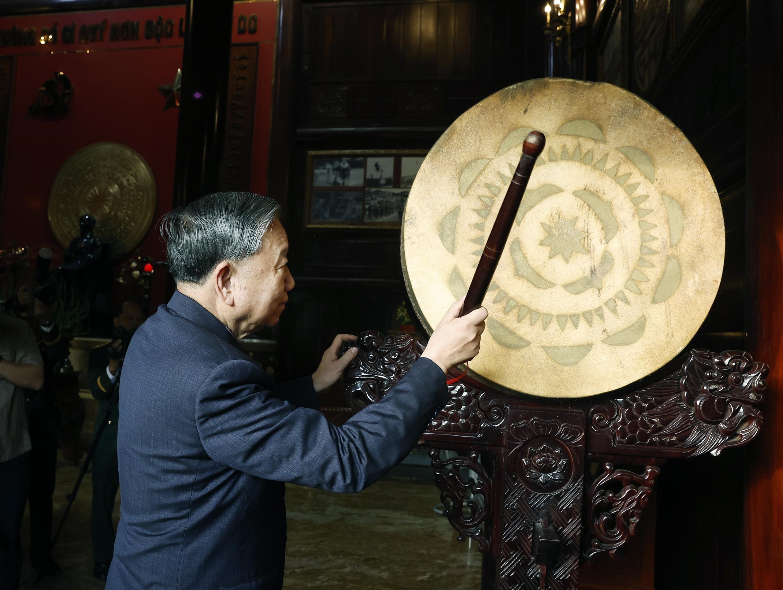 Tổng Bí thư Tô Lâm đánh trống tại Nhà tưởng niệm Chủ tịch Hồ Chí Minh. Ảnh: Thống Nhất – TTXVN