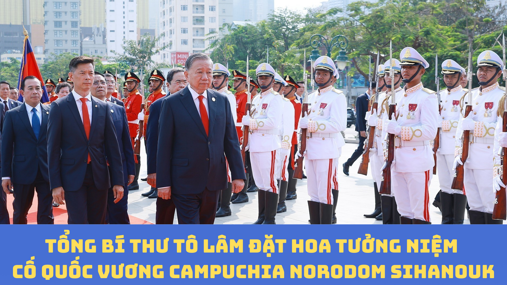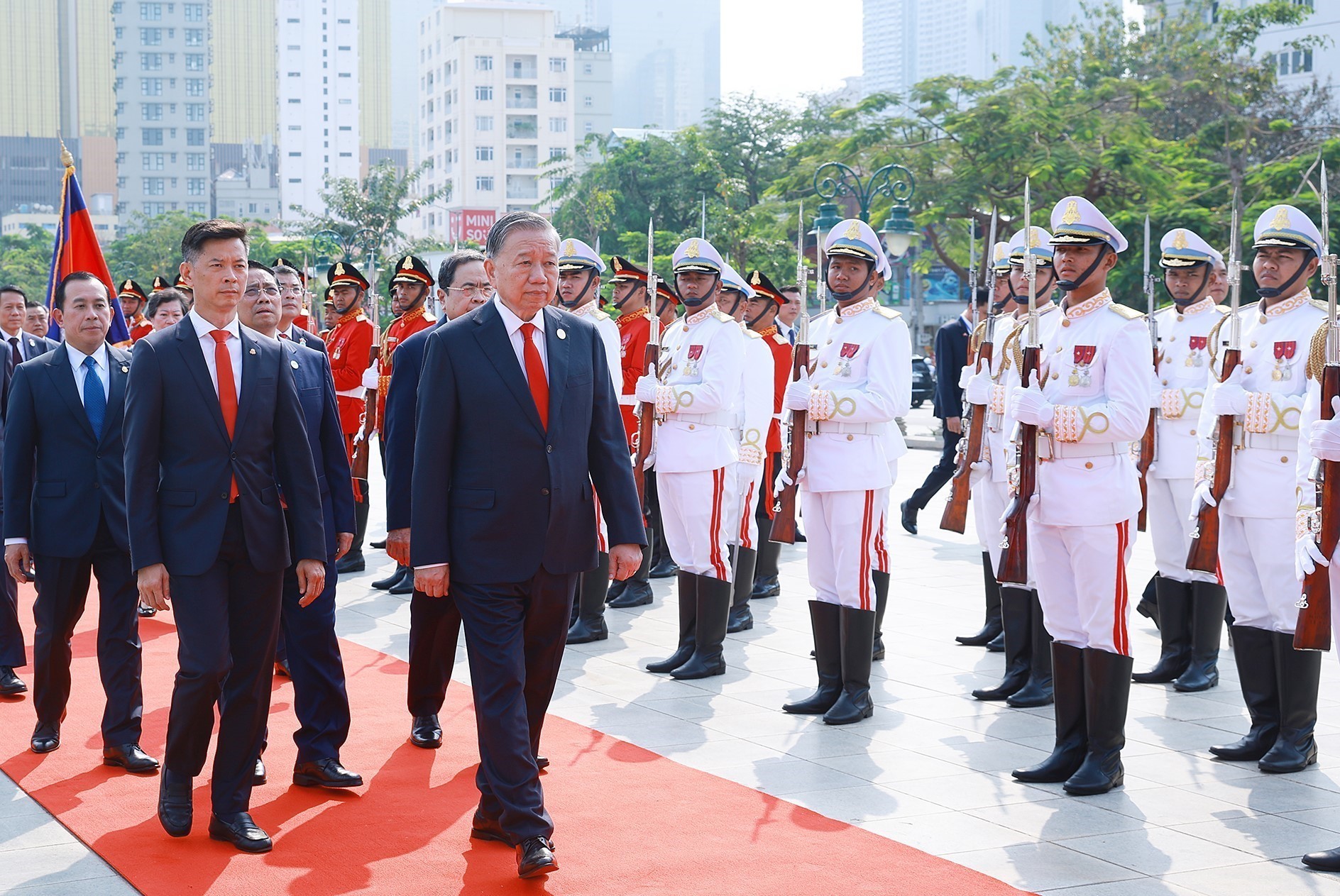 Ngay sau khi đến thủ đô Phnom Penh của Campuchia, sáng 6/2, Lễ đón chính thức Tổng Bí thư Tô Lâm đã được tổ chức trọng thể tại Hoàng cung. Cùng dự Lễ đón có Thủ tướng Chính phủ Phạm Minh Chính, Chủ tịch Quốc hội Trần Thanh Mẫn và Đoàn đại biểu cấp cao Việt Nam.