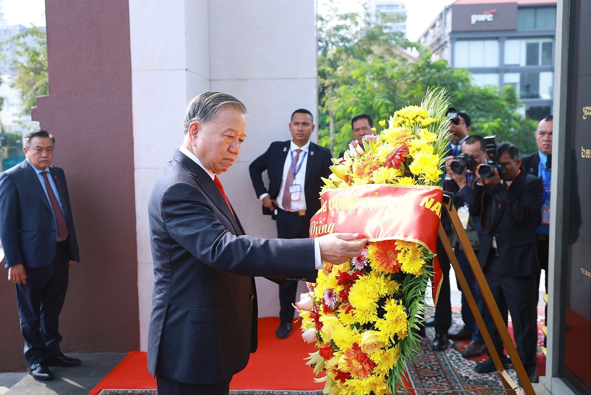 Tổng Bí thư Tô Lâm đến đặt vòng hoa tại Đài tưởng niệm Cố Quốc vương Campuchia Norodom Sihanouk. Ảnh: Dương Giang-TTXVN