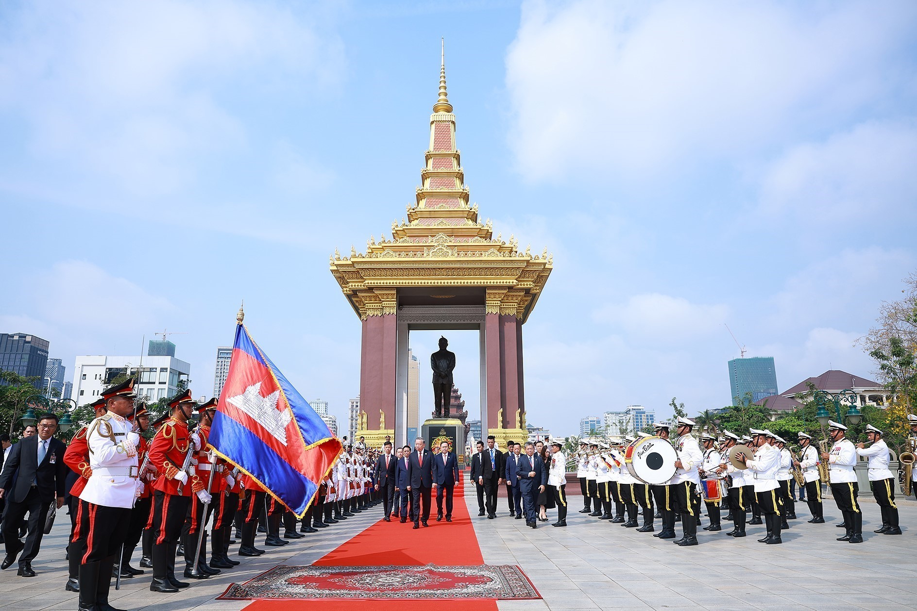 Trong chương trình thăm cấp Nhà nước tới Vương quốc Campuchia, sáng 6/2/2026, tại Thủ đô Phnom Penh, Tổng Bí thư Tô Lâm và đoàn đại biểu cấp cao Việt Nam đến đặt vòng hoa tại Đài tưởng niệm Cố Quốc vương Campuchia Preah Bat Samdech Preah Norodom Sihanouk.