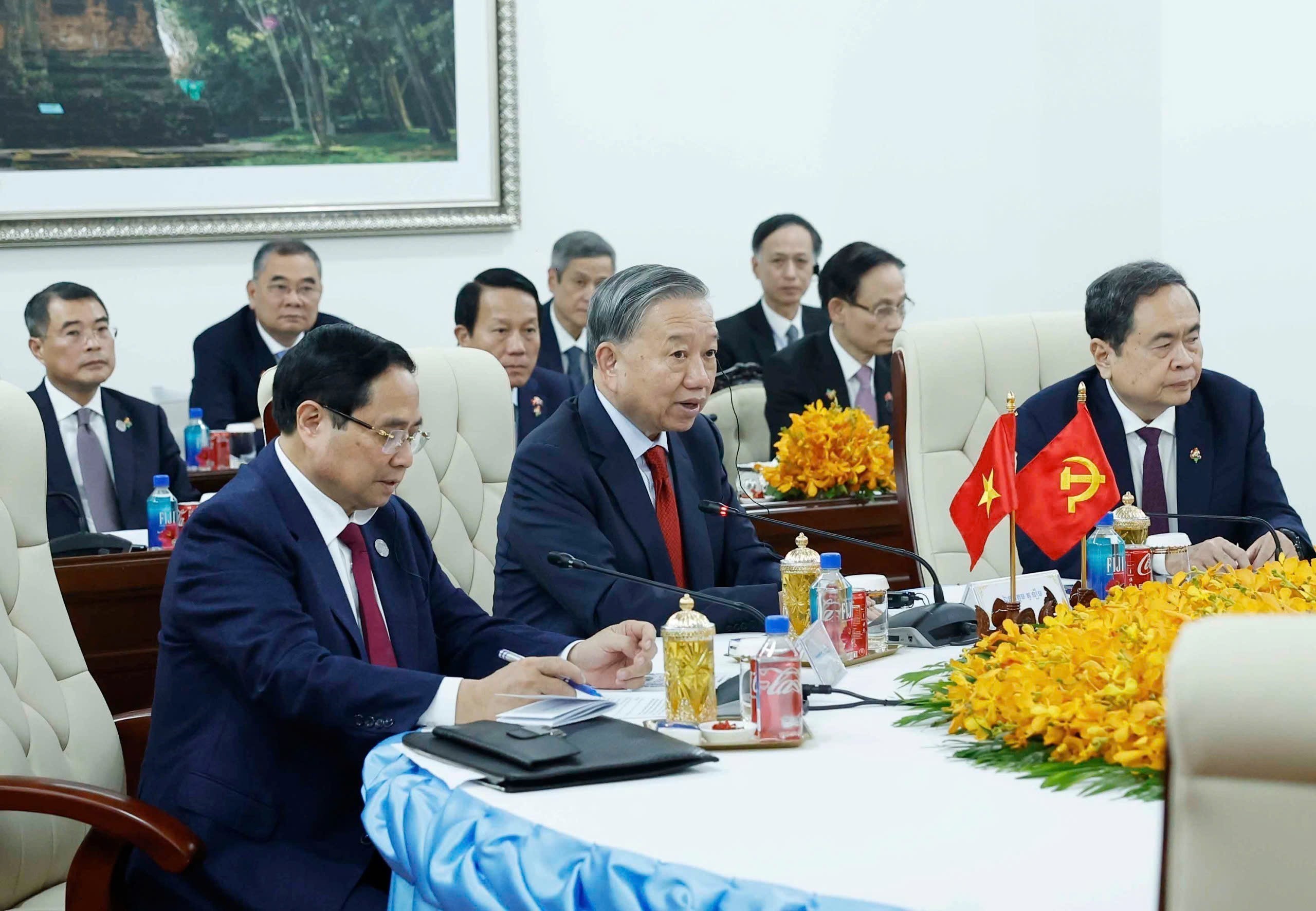 Chủ tịch CPP Hun Sen và Tổng Bí thư Đảng Nhân dân Cách mạng Lào Thongloun Sisoulith cảm ơn Tổng Bí thư Tô Lâm đã thông báo về thành tựu trong phát triển kinh tế - xã hội; đặc biệt là thành công của Đại hội XIV; đánh giá cao đường lối đổi mới toàn diện, tư duy chiến lược và năng lực lãnh đạo của Đảng Cộng sản Việt Nam trong giai đoạn phát triển mới; tin tưởng dưới sự lãnh đạo sáng suốt của Đảng Cộng sản Việt Nam đứng đầu là Tổng Bí thư Tô Lâm, Việt Nam sẽ đạt được nhiều thắng lợi trong việc thực hiện Nghị quyết Đại hội XIV, tiến tới đạt mục tiêu trở thành nước đang phát triển có công nghiệp hiện đại, thu nhập trung bình cao vào năm 2030 và trở thành nước xã hội chủ nghĩa phát triển, thu nhập cao vào năm 2045.