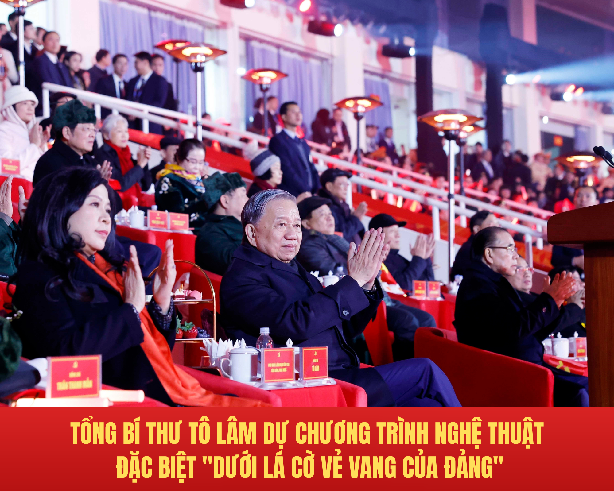 Tối 23/1/2026, tại Hà Nội, Tổng Bí thư Tô Lâm, các đồng chí lãnh đạo, nguyên lãnh đạo Đảng, Nhà nước và các đại biểu dự chương trình nghệ thuật đặc biệt Dưới lá cờ vẻ vang của Đảng do Thành uỷ, Hội đồng nhân dân, Uỷ ban Mặt trận tổ quốc Việt Nam Thành phố Hà Nội tổ chức.