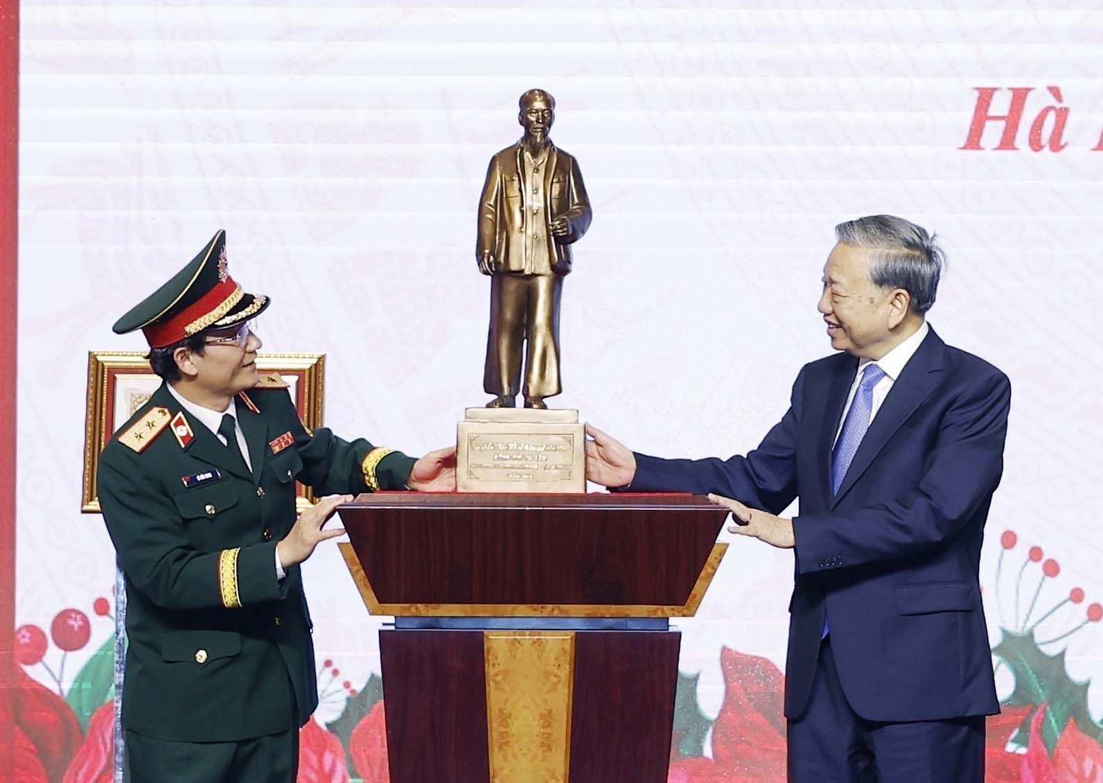 Tổng Bí thư Tô Lâm, Bí Quân ủy Trung ương tặng bức tượng chân dung Chủ tịch Hồ Chí Minh cho Bệnh viện Trung ương Quân đội 108. Ảnh: Thống Nhất – TTXVN