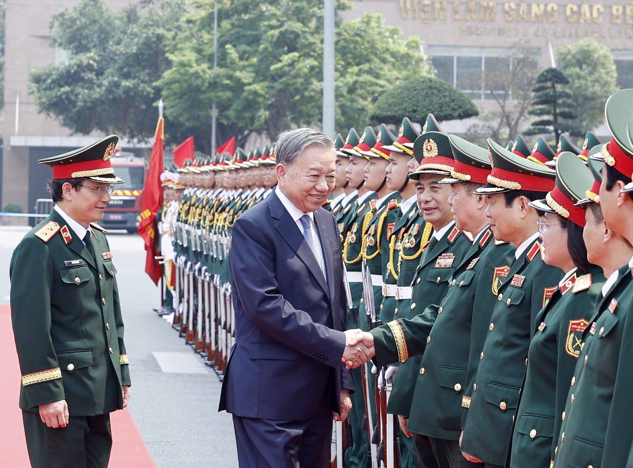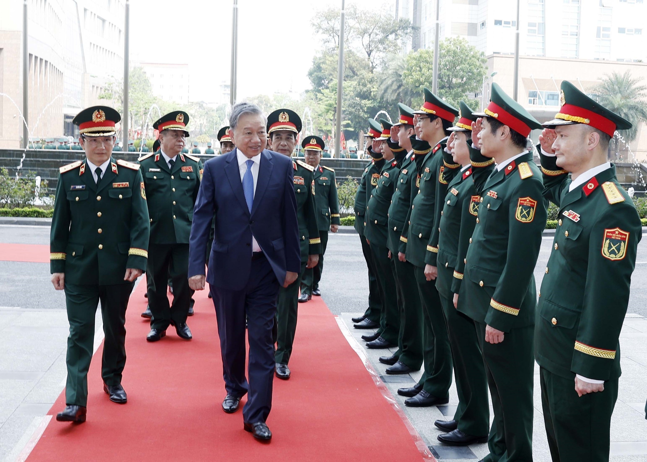 Lễ đón Tổng Bí thư Tô Lâm, Bí Quân ủy Trung ương đến dự lễ kỷ niệm. Ảnh: Thống Nhất – TTXVN