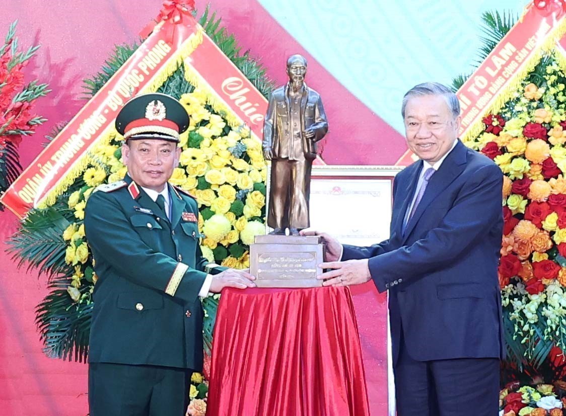 Tổng Bí thư Tô Lâm tặng bức tượng Chủ tịch Hồ Chí Minh cho Tổng cục II, Bộ Quốc phòng. Ảnh: Thống Nhất - TTXVN