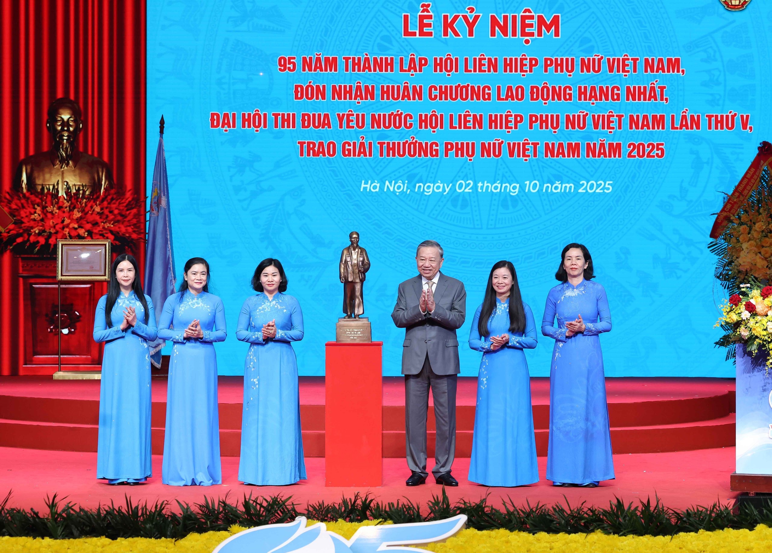Tổng Bí thư Tô Lâm tặng bức tượng Chủ tịch Hồ Chí Minh cho Hội Liên hiệp Phụ nữ Việt Nam. Ảnh: TTXVN