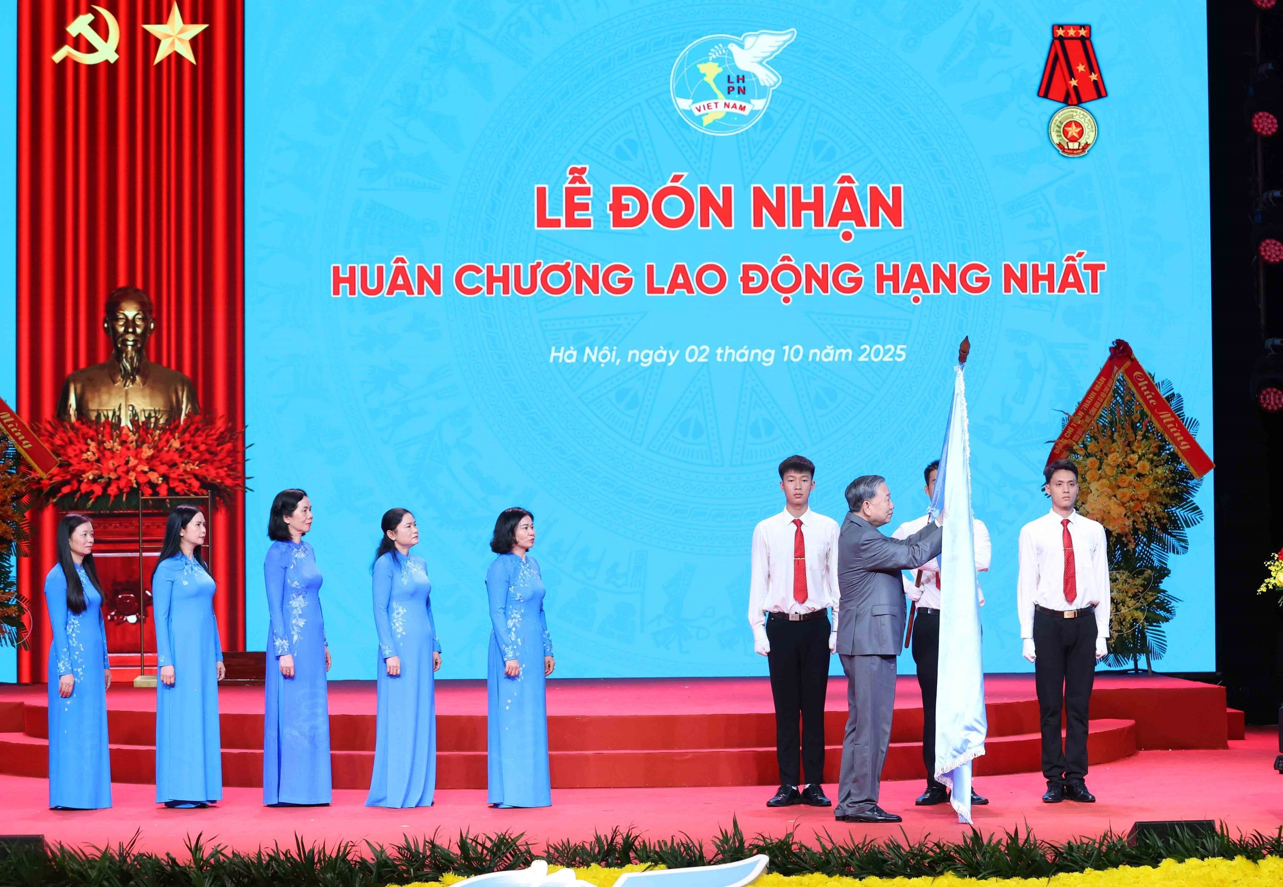 Tổng Bí thư Tô Lâm trao Huân chương Lao động hạng Nhất cho Hội Liên hiệp Phụ nữ Việt Nam. Ảnh: Phương Hoa - TTXVN