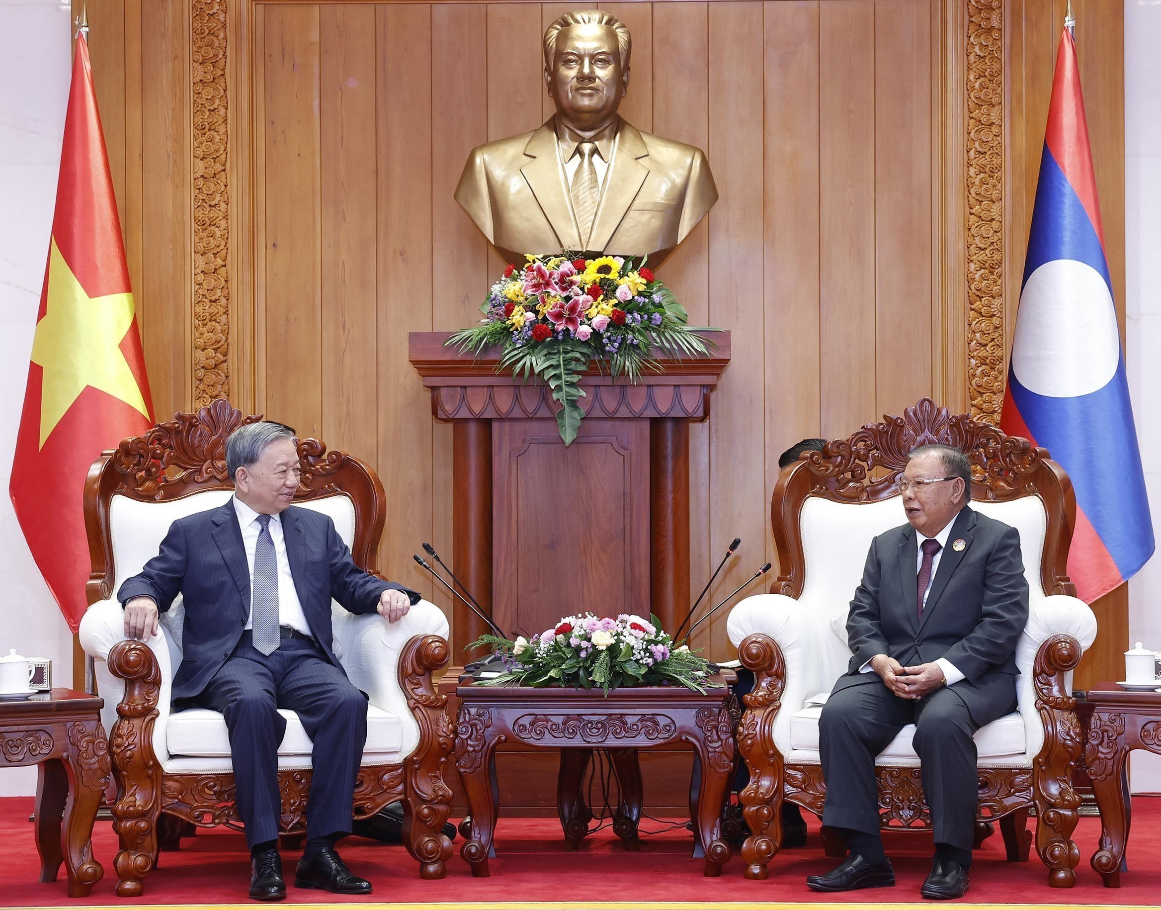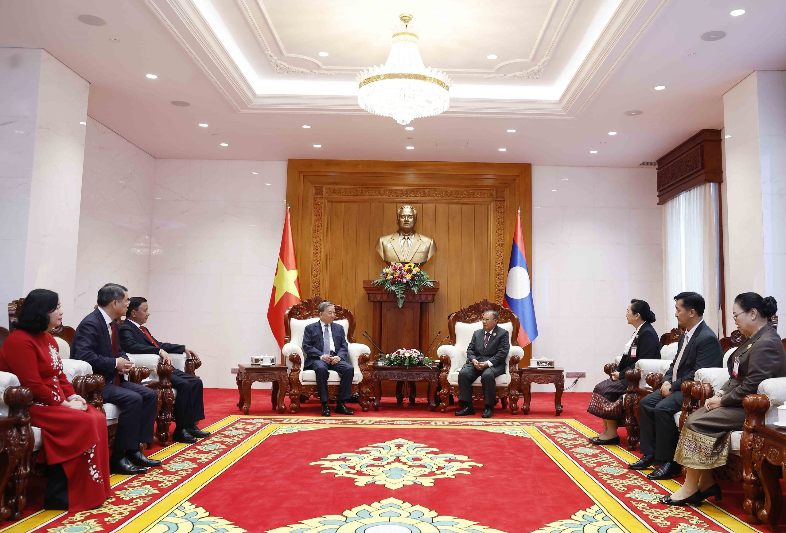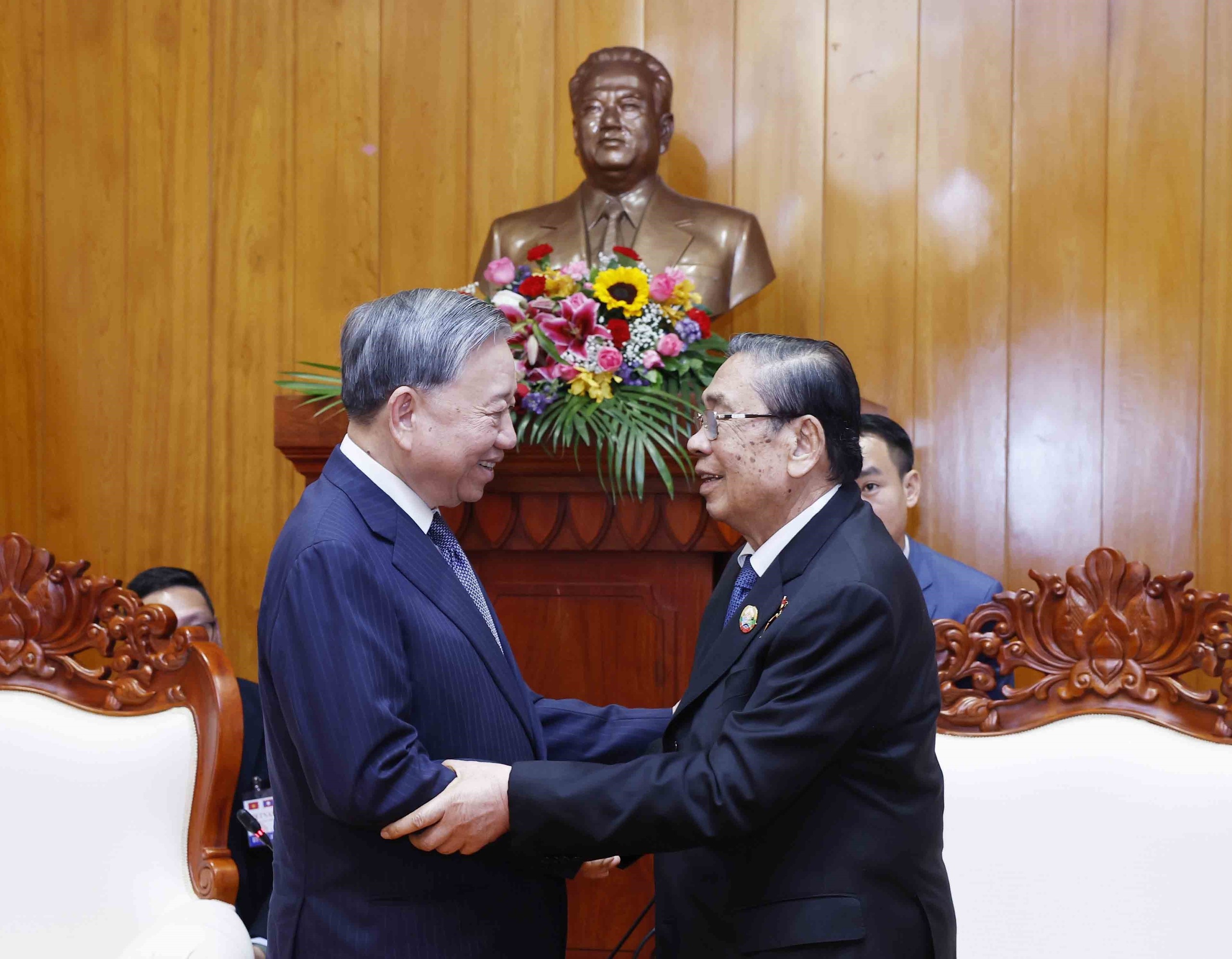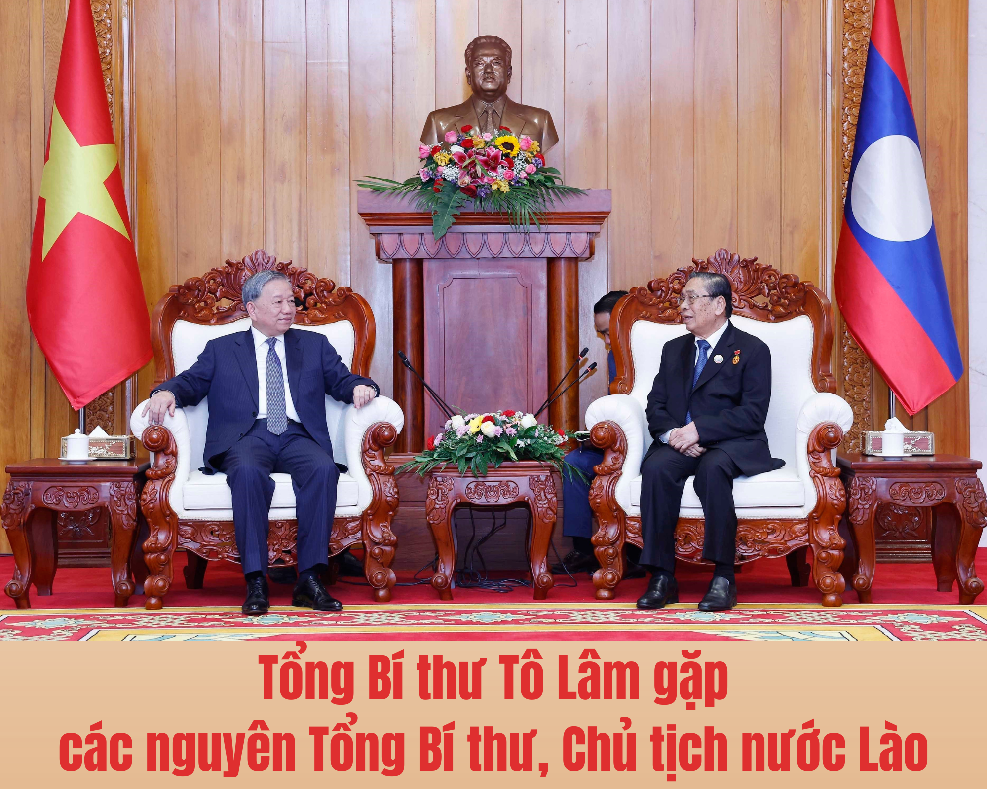 Sáng 2/12/2025, tại thủ đô Vientiane, Tổng Bí thư Tô Lâm gặp nguyên Tổng Bí thư, Chủ tịch nước Lào Bounnhang Vorachit và nguyên Tổng Bí thư, Chủ tịch nước Lào Choummaly Sayasone.