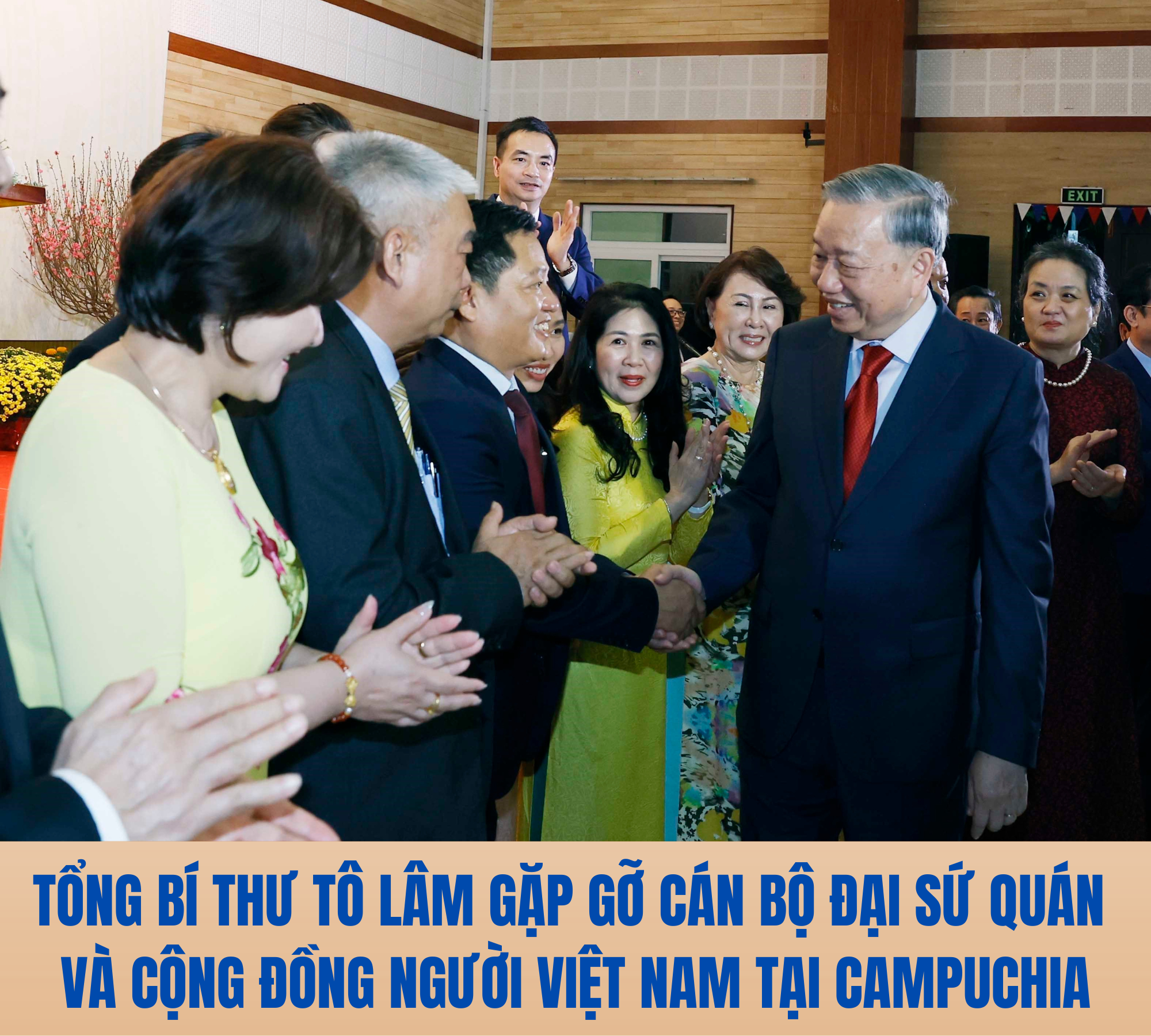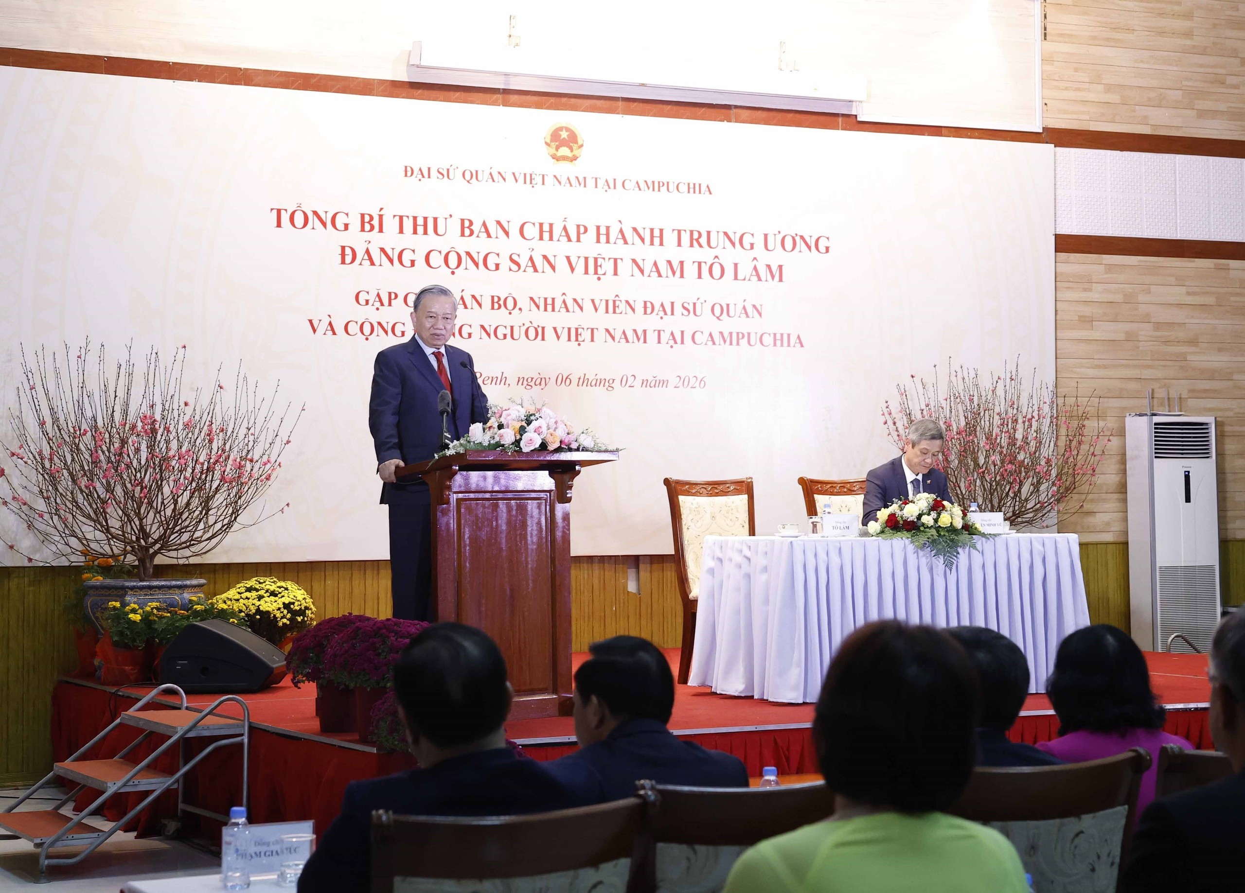 Trong chuyến thăm cấp Nhà nước tới Vương quốc Campuchia, chiều 6/2, tại thủ đô Phnom Penh, Tổng Bí thư Tô Lâm đã có cuộc gặp gỡ cán bộ, nhân viên Đại sứ quán Việt Nam tại Campuchia và cộng đồng người Việt Nam đang sinh sống, làm việc và học tập tại đất nước Chùa Tháp.
