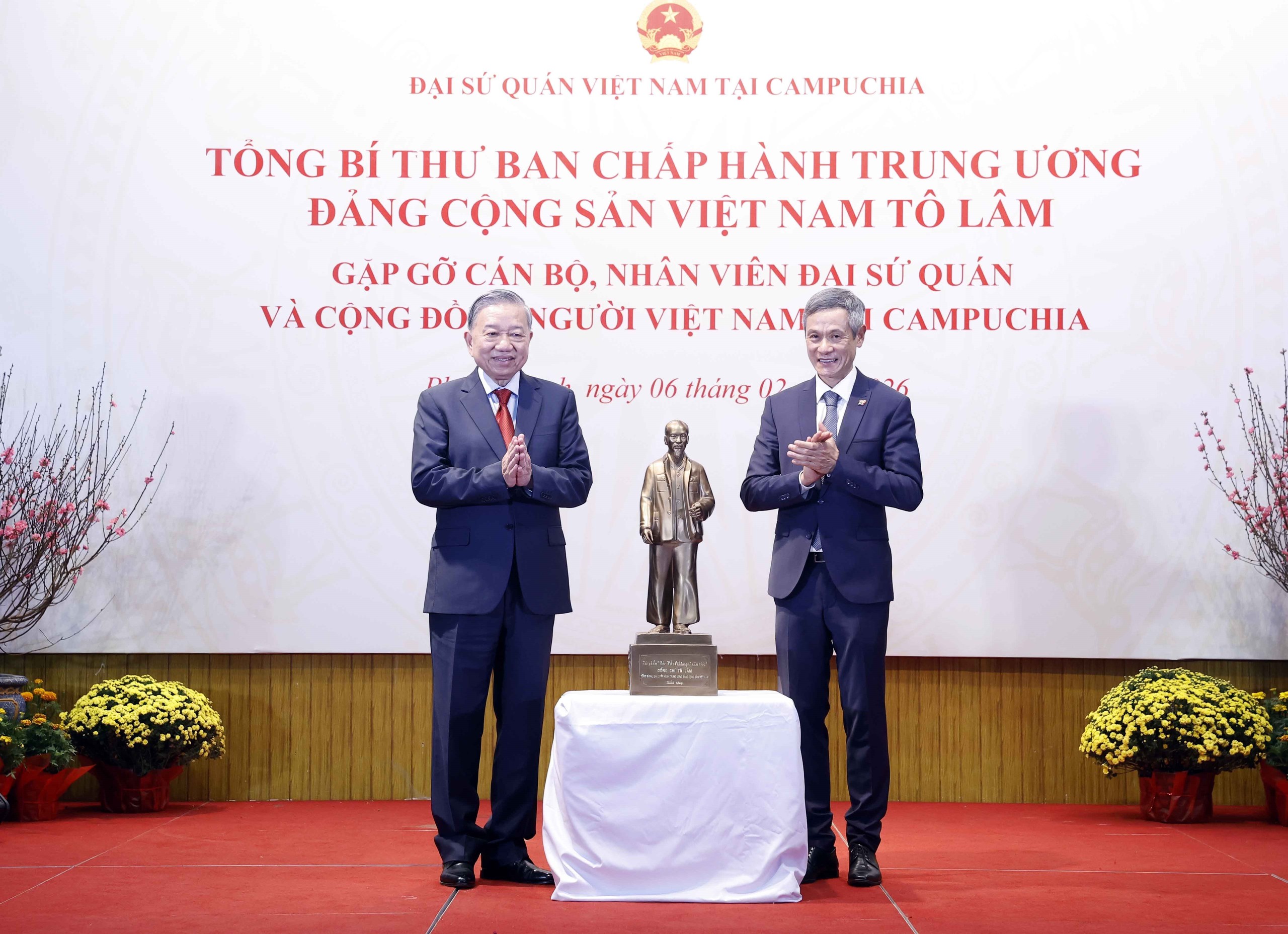 Tổng Bí thư Tô Lâm tặng bức tượng Bác Hồ cho Đại sứ quán Việt Nam tại Campuchia. Ảnh: Thống Nhất – TTXVN