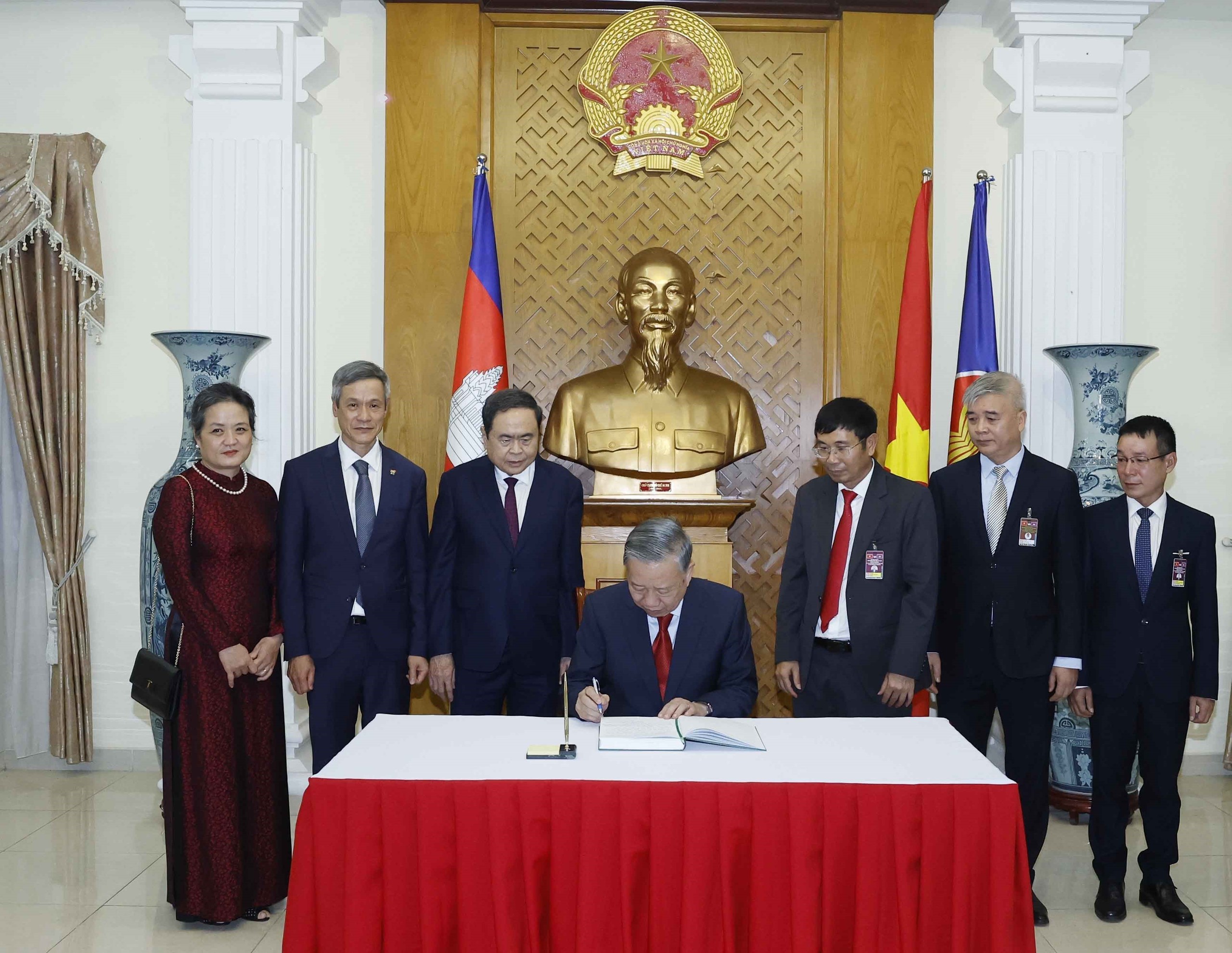 Cùng dự có Thủ tướng Chính phủ Phạm Minh Chính, Chủ tịch Quốc hội Trần Thanh Mẫn, cùng các thành viên đoàn đại biểu cấp cao Việt Nam; đại diện Hội Khmer-Việt Nam tại Campuchia (KVA), Hiệp hội Doanh nghiệp Việt Nam-Campuchia (VCBA), cùng đông đảo trí thức, lưu học sinh và kiều bào tại Campuchia.