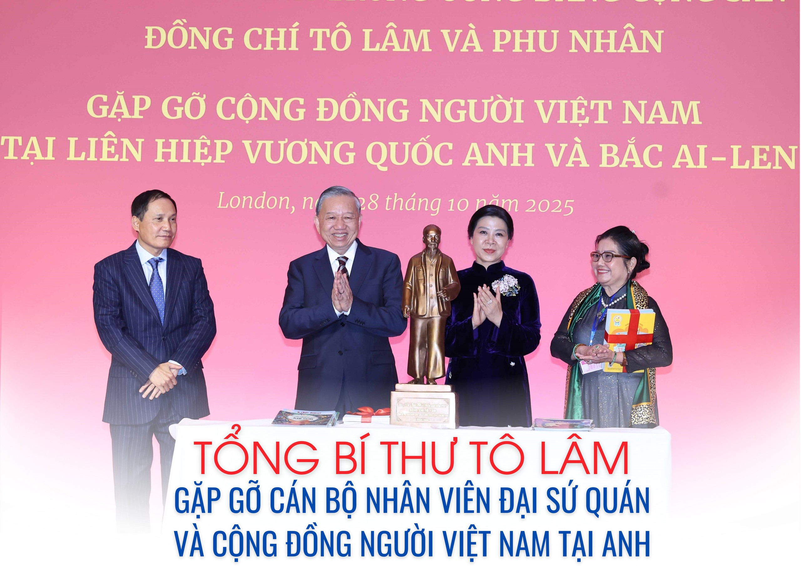 Theo đặc phái viên và phóng viên TTXVN tại London, trong khuôn khổ chuyến thăm chính thức Liên hiệp Vương quốc Anh và Bắc Ireland (gọi tắt là Anh), chiều tối 28/10, theo giờ địa phương, tại Khách sạn Raffles ở thủ đô London, Tổng Bí thư Tô Lâm và Phu nhân cùng Đoàn đại biểu cấp cao Việt Nam đã có cuộc gặp gỡ thân mật với đông đảo kiều bào đang sinh sống, lao động và học tập tại Anh, đại diện hội đoàn người Việt tại Anh cùng các cán bộ, nhân viên Đại sứ quán Việt Nam tại Anh.