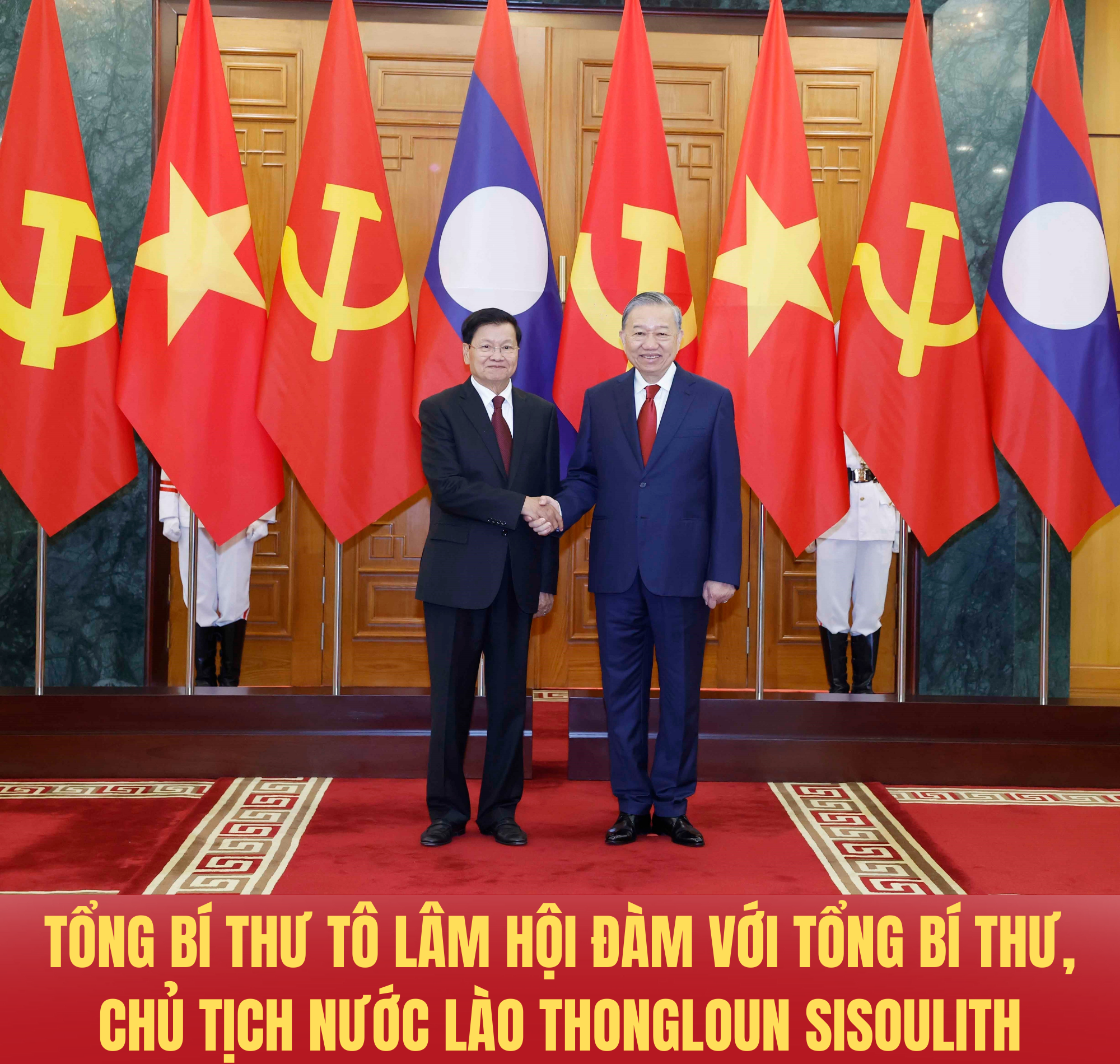 Tại buổi hội đàm, nhiệt liệt chúc mừng đồng chí Thongloun Sisoulith được bầu lại làm Tổng Bí thư Đảng Nhân dân Cách mạng Lào, Tổng Bí thư Tô Lâm nhiệt liệt chào mừng Tổng Bí thư, Chủ tịch nước Lào và Phu nhân cùng Đoàn đại biểu cấp cao Đảng, Nhà nước Lào thăm cấp Nhà nước Việt Nam; bày tỏ trân trọng và đánh giá cao việc Tổng Bí thư, Chủ tịch nước Lào đến Việt Nam là quốc gia đầu tiên thăm trên cương vị Tổng Bí thư, Chủ tịch nước Lào ngay sau thành công tốt đẹp của Đại hội nhiệm kỳ mới của mỗi Đảng. Tổng Bí thư Tô Lâm khẳng định chuyến thăm có ý nghĩa và dấu mốc lịch sử, thể hiện sâu sắc sự coi trọng đặc biệt của Đảng, Nhà nước Lào và cá nhân đồng chí Thongloun Sisoulith với mối quan hệ Việt Nam – Lào. Tổng Bí thư Tô Lâm bày tỏ tin tưởng chuyến thăm sẽ thành công tốt đẹp, đưa quan hệ giữa hai nước lên tầm cao mới; khẳng định quyết tâm của lãnh đạo và nhân dân hai nước trong việc gìn giữ và phát huy mối quan hệ hữu nghị vĩ đại, đoàn kết đặc biệt, hợp tác toàn diện, gắn kết chiến lược Việt Nam - Lào. Nhân dịp này, Tổng Bí thư Tô Lâm chân thành cảm ơn Đảng, Nhà nước, Nhân dân Lào và cá nhân Tổng Bí thư, Chủ tịch nước Thongloun Sisoulith đã dành tình cảm nồng ấm và sự đón tiếp trọng thị, thắm tình anh em đối với Đoàn đại biểu cấp cao Đảng, Nhà nước Việt Nam thăm cấp nhà nước Lào tháng 12/2025.