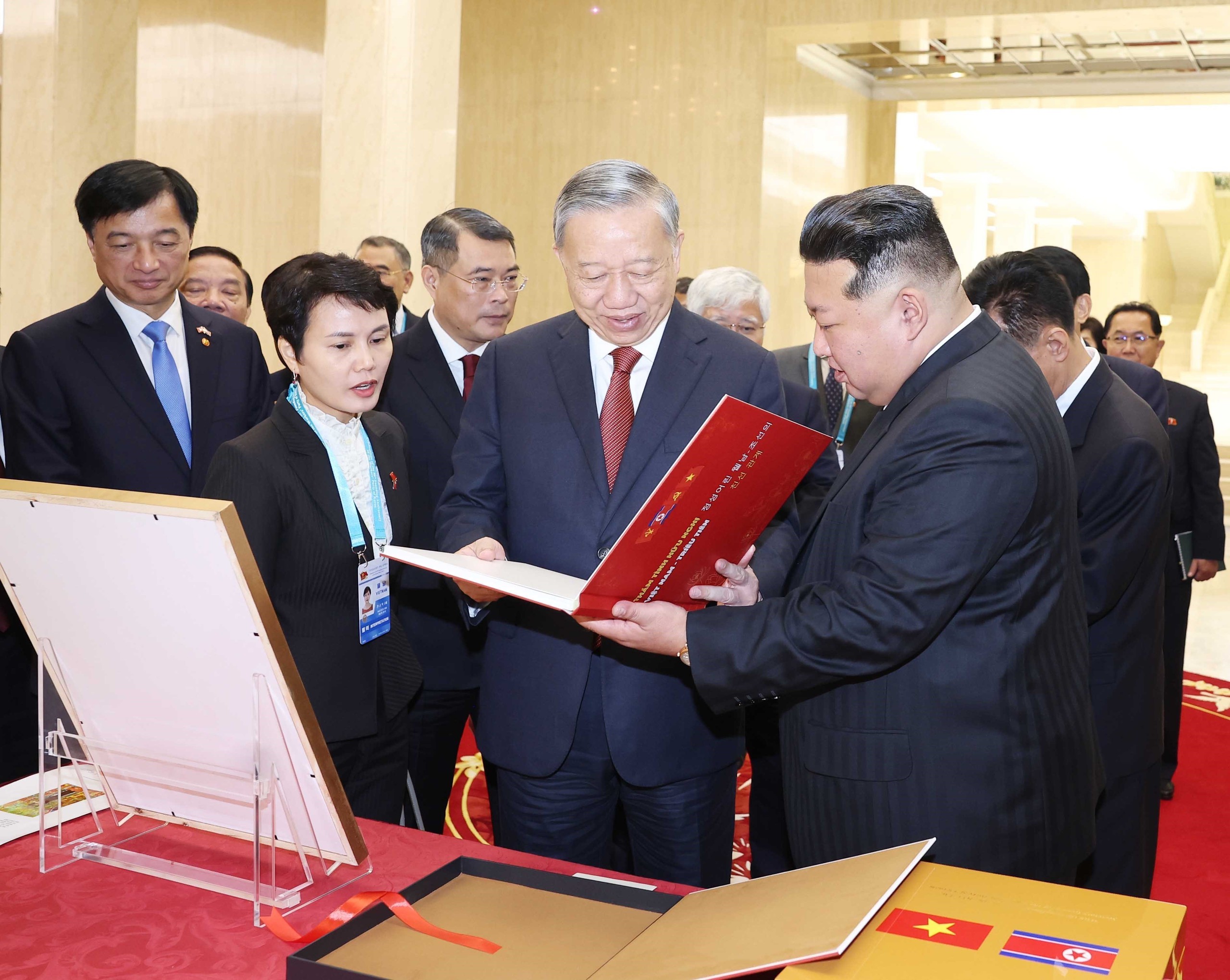 Sau khi kết thúc hội đàm, Tổng Bí thư Tô Lâm trao tặng Tổng Bí thư, Chủ tịch Quốc vụ CHDCND Triều Tiên Kim Jong Un cuốn sách ảnh "Thắm tình hữu nghị Việt Nam - Triều Tiên". Ảnh: Thống Nhất – TTXVN