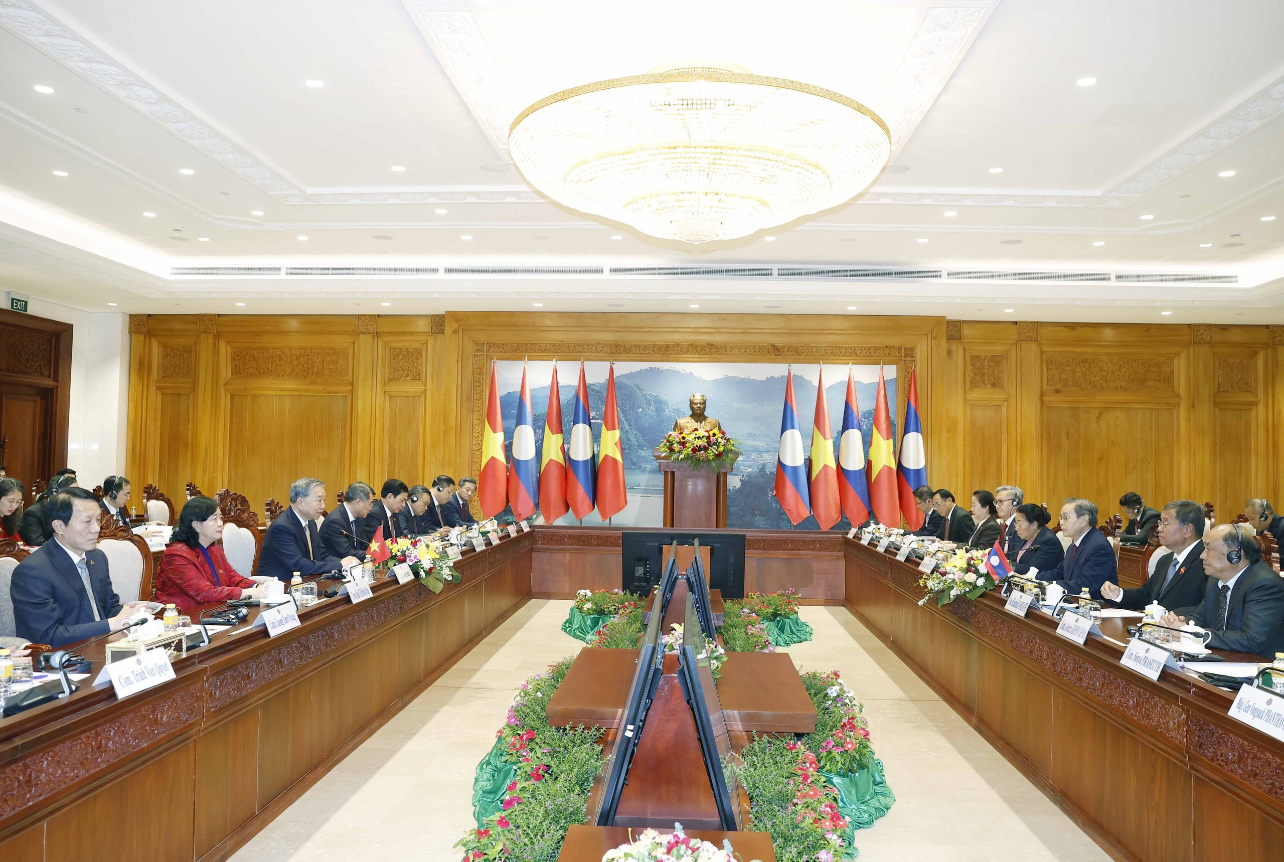 Tổng Bí thư Tô Lâm đánh giá cao vai trò, trách nhiệm và những đóng góp quan trọng của Quốc hội Lào trong việc cụ thể hóa và bảo đảm thực hiện hiệu quả chiến lược phát triển đất nước; bày tỏ tin tưởng với vai trò cơ quan quyền lực nhà nước cao nhất, đồng hành chặt chẽ cùng với Đảng và Chính phủ trong việc thể chế hóa kịp thời, đồng bộ đường lối đổi mới, các chủ trương lớn về phát triển kinh tế - xã hội, giữ vững ổn định chính trị và bảo đảm lợi ích thiết thực của nhân dân Lào, thực hiện thắng lợi Nghị quyết Đại hội XII của Đảng.