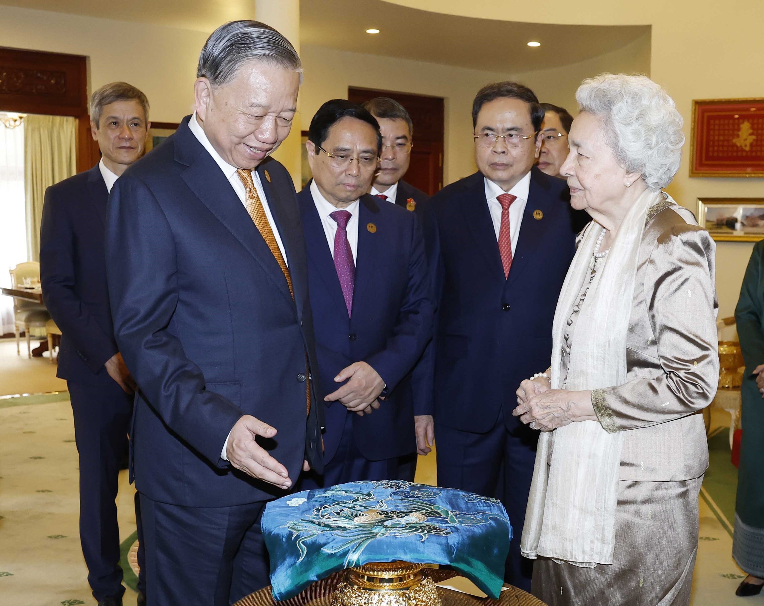 Tổng Bí thư Tô Lâm thăm hỏi, nói chuyện thân mật với Hoàng thái hậu Norodom Monineath Sihanouk. Ảnh: Thống Nhất – TTXVN