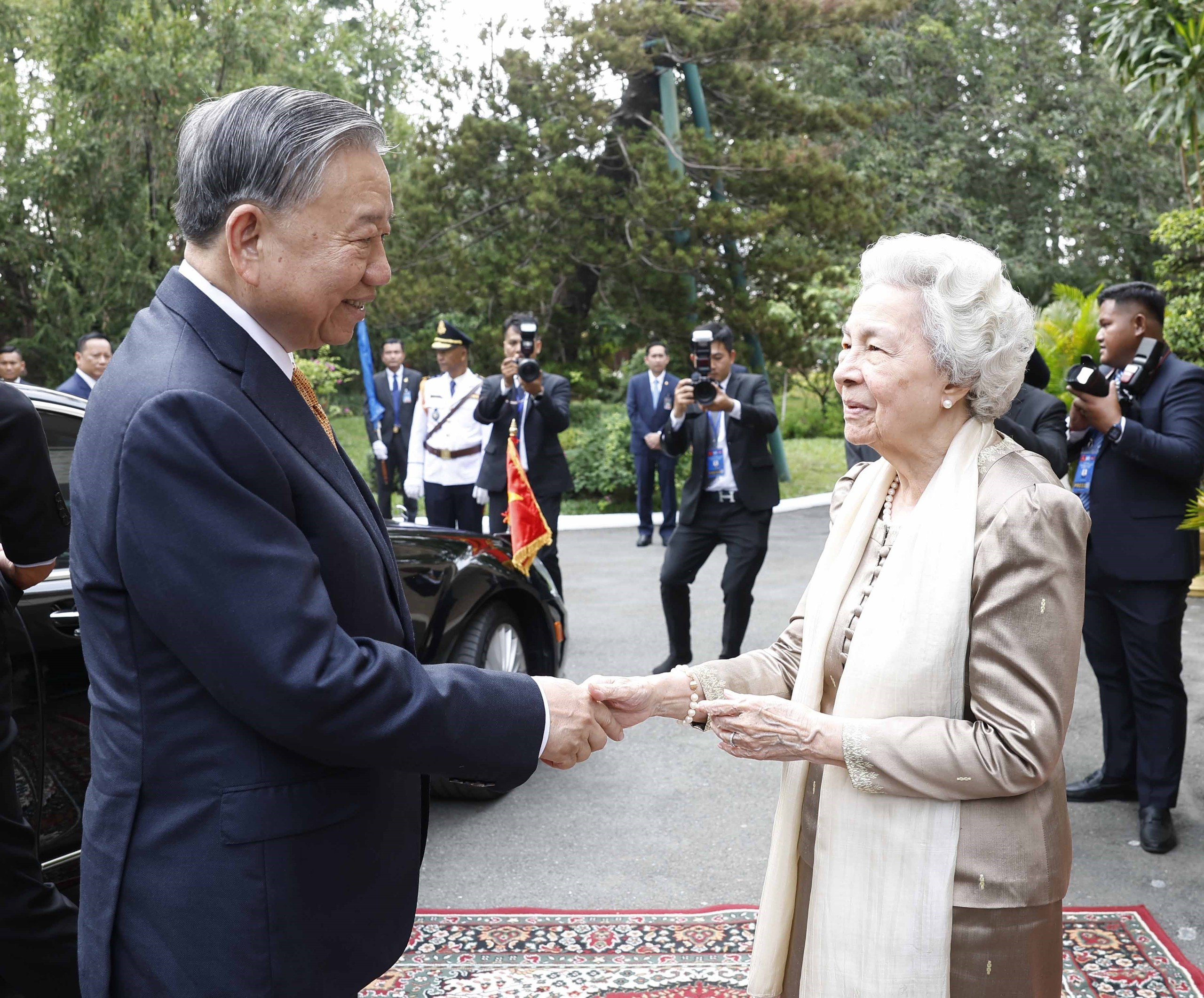 Hoàng thái hậu Norodom Monineath Sihanouk đón Tổng Bí thư Tô Lâm đến thăm. Ảnh: Thống Nhất – TTXVN