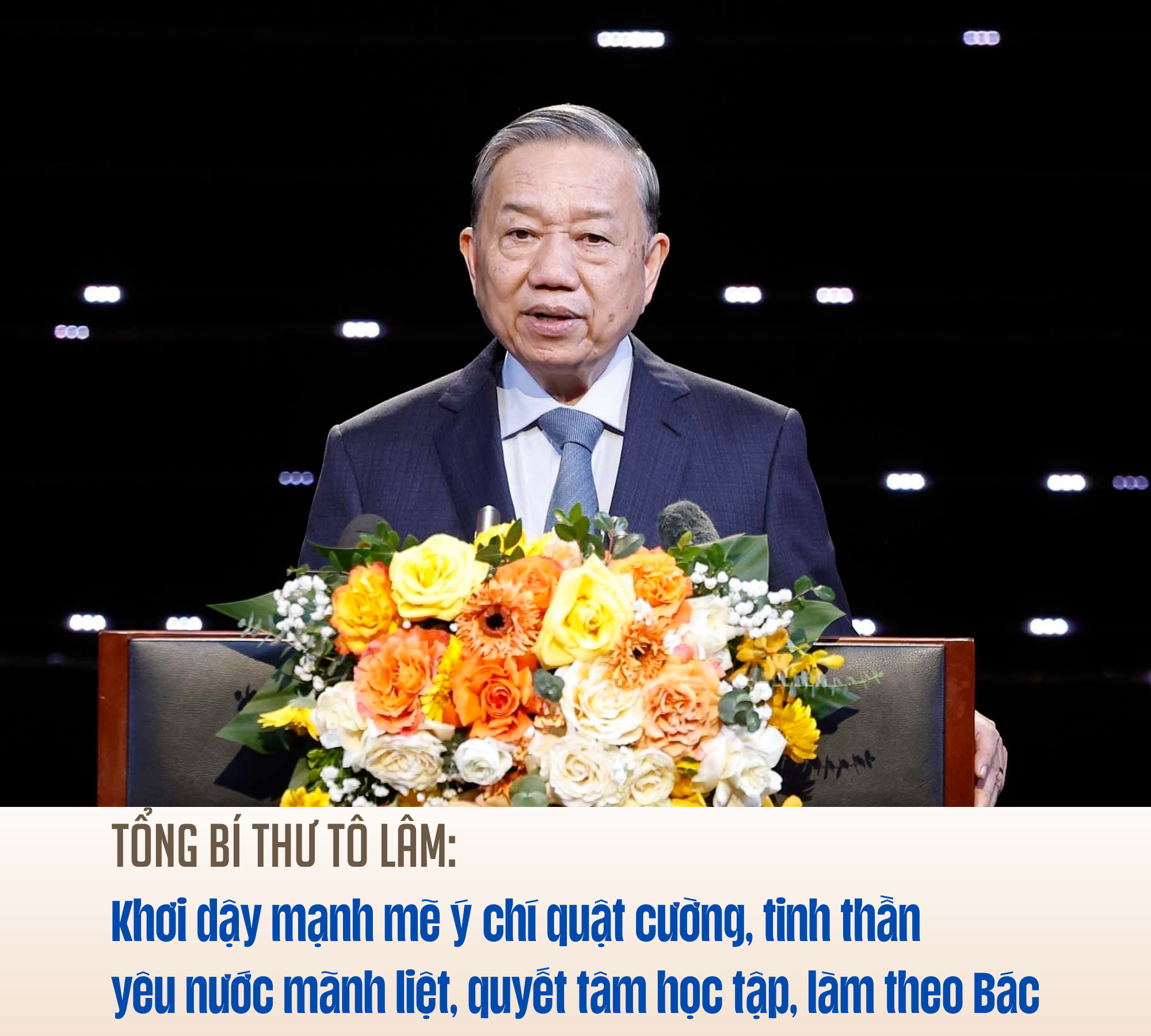 Tổng Bí thư yêu cầu, cấp ủy, chính quyền các cấp phải tập trung lãnh đạo, chỉ đạo, tiếp tục khơi dậy mạnh mẽ ý chí quật cường, tinh thần yêu nước mãnh liệt, quyết tâm học tập, làm theo Bác trong toàn Đảng, toàn dân, toàn quân ta để thực hiện thắng lợi Nghị quyết Đại hội XIV và các chủ trương chiến lược của Đảng. Toàn Đảng, toàn hệ thống chính trị tập trung cao độ vận hành hiệu năng, hiệu lực, hiệu quả mô hình chính quyền địa phương 2 cấp, phát huy mạnh mẽ động lực, không gian mới cho phát triển, không ngừng chăm lo đời sống của nhân dân, nhất là người yếu thế, không để ai bị bỏ lại phía sau.