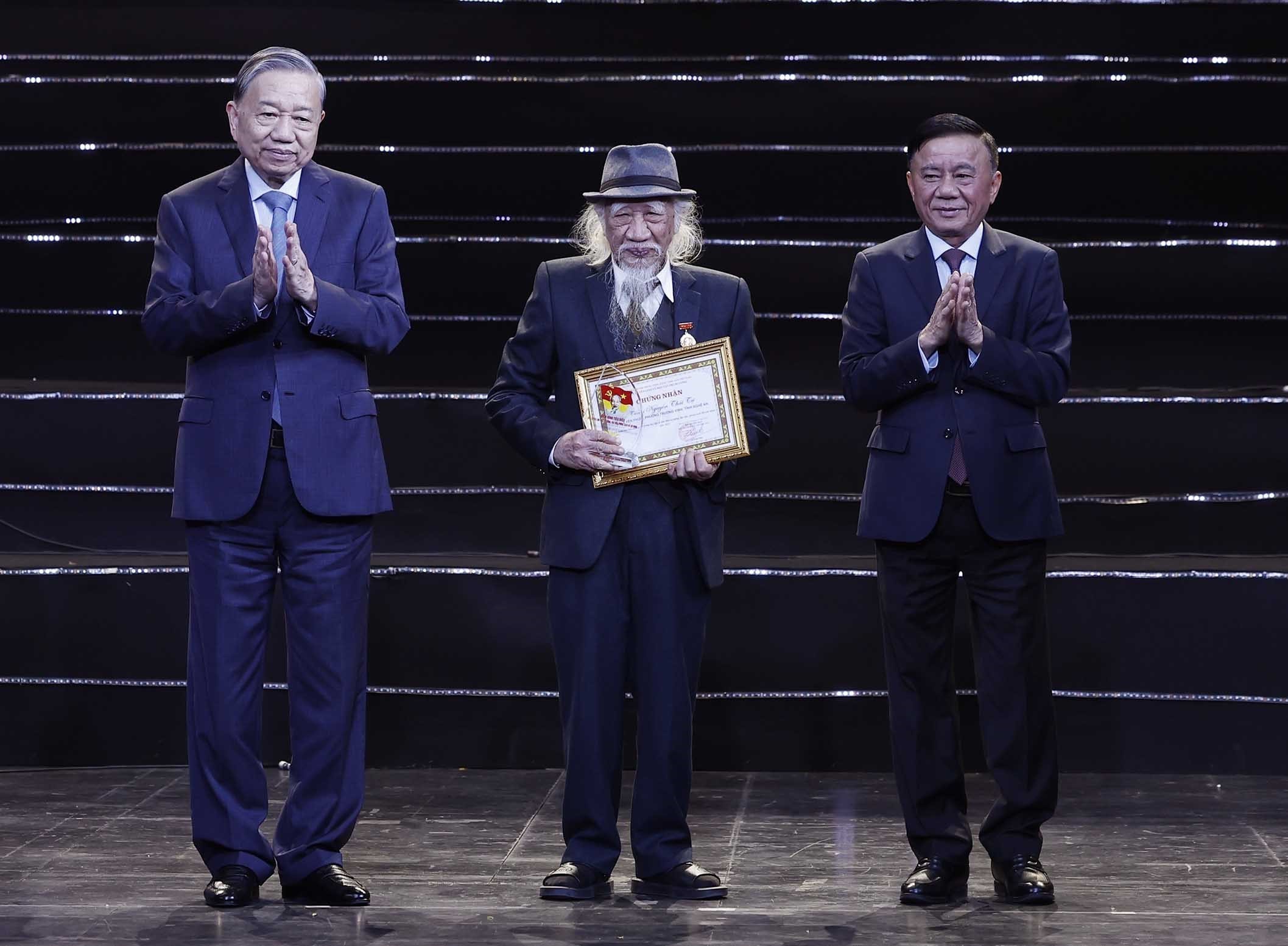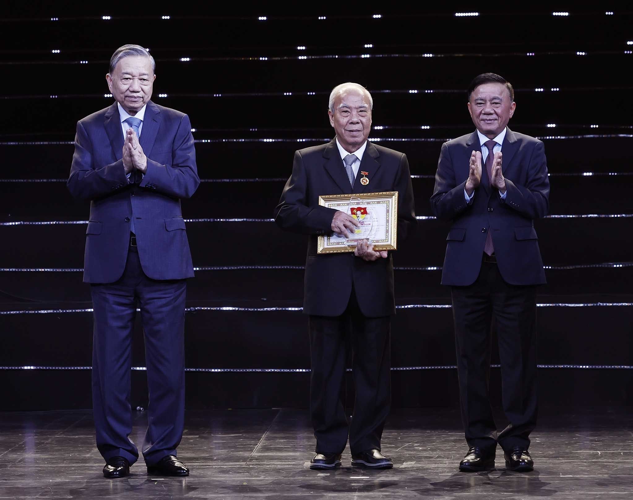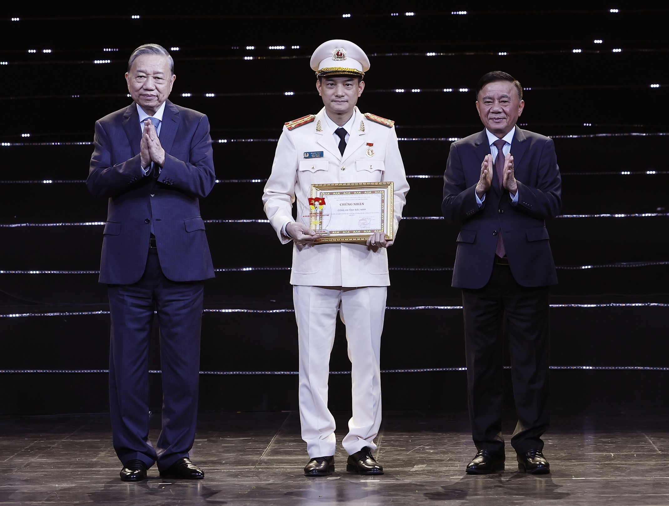 Tổng Bí thư Tô Lâm và đồng chí Trần Cẩm Tú, Uỷ viên Bộ Chính trị, Thường trực Ban Bí thư trao Giấy chứng nhận và biểu trưng cho các tập thể và cá nhân điển hình tiêu biểu. Ảnh: Thống Nhất – TTXVN