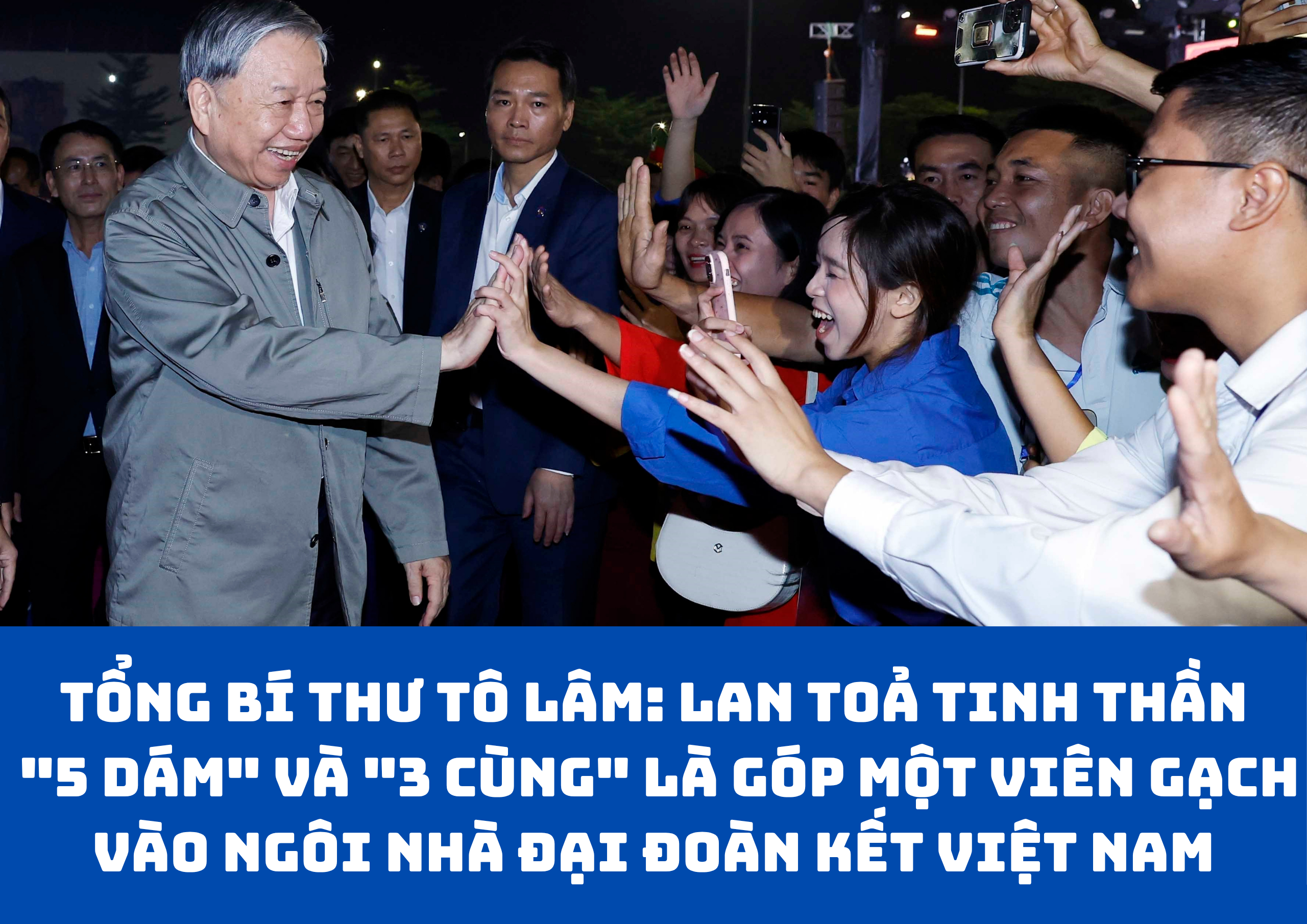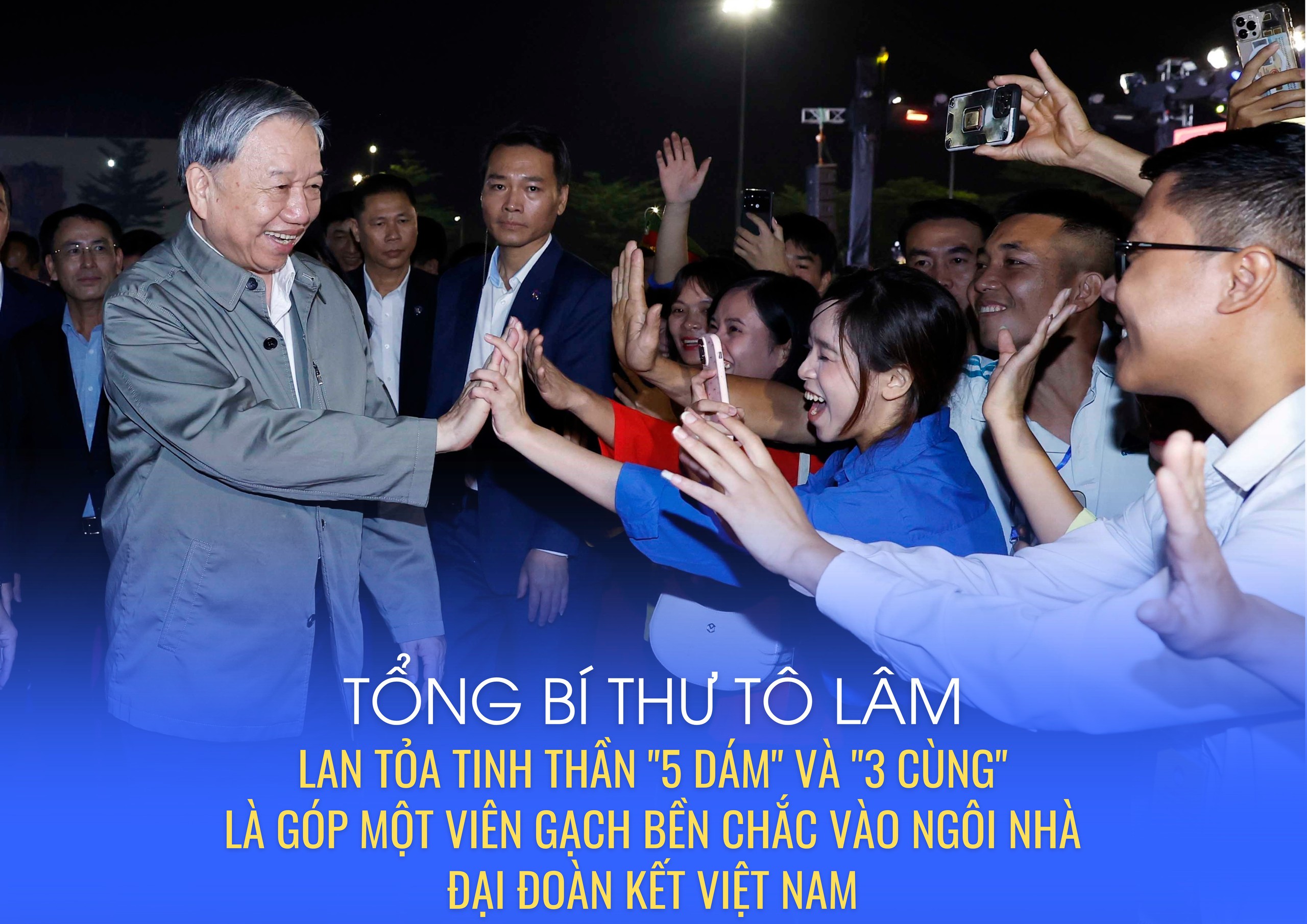 Tổng Bí thư mong muốn, hãy khắc ghi và lan tỏa tinh thần "5 dám" (dám nghĩ, dám nói, dám làm, dám chịu trách nhiệm, dám đổi mới sáng tạo vì lợi ích chung) và "3 cùng" (cùng bàn, cùng làm, cùng hưởng), nếu thực hiện như vậy là đã góp một viên gạch bền chắc vào ngôi nhà đại đoàn kết Việt Nam.