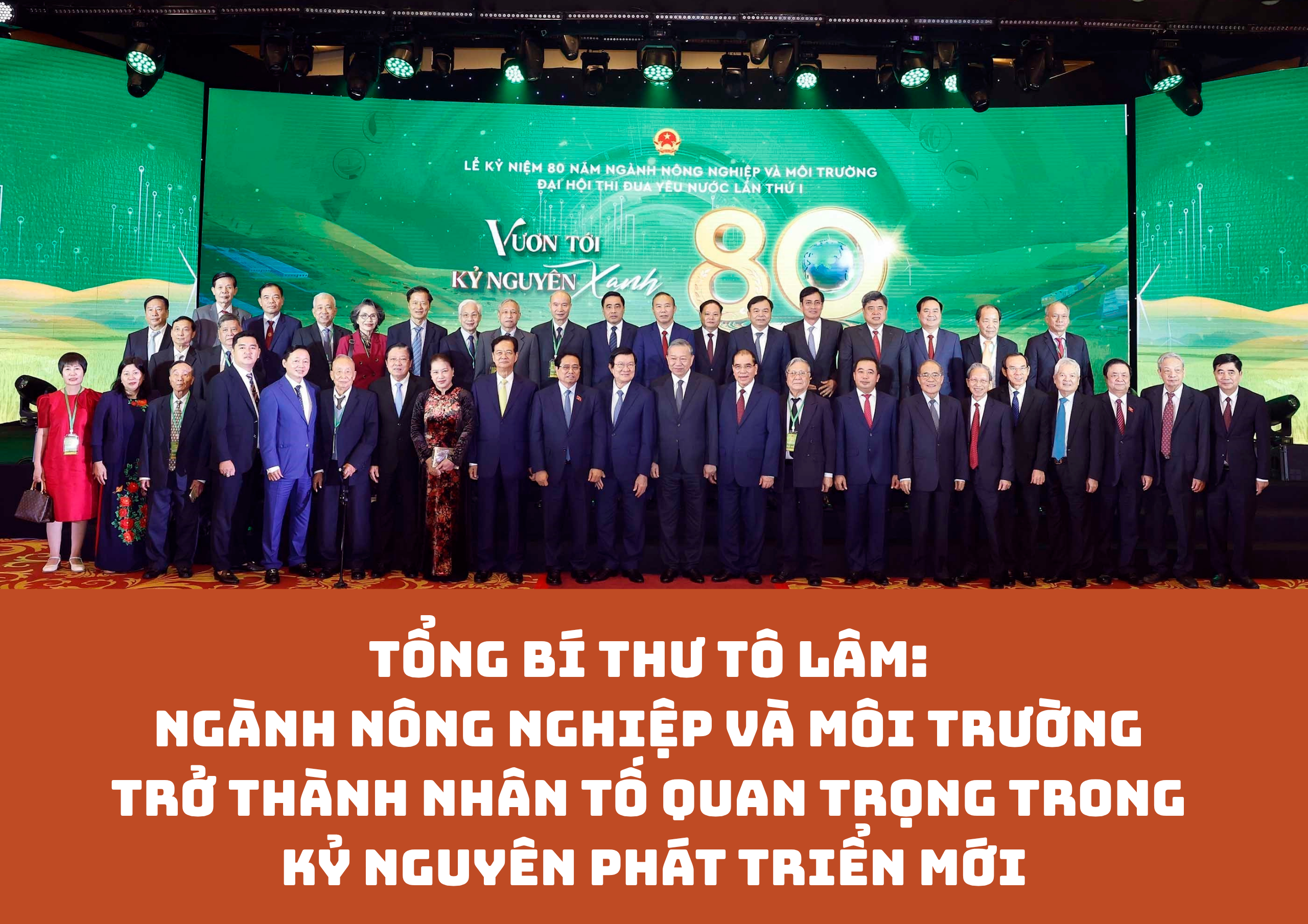 Tổng Bí thư khẳng định, trải qua 80 năm xây dựng, chiến đấu và trưởng thành, ngành Nông nghiệp và Môi trường luôn đồng hành cùng lịch sử dân tộc, trở thành trụ cột của nền kinh tế, nền tảng của sinh kế và nay đã trở thành nhân tố quan trọng trong công cuộc phát triển, chuyển mình của quốc gia trong kỷ nguyên phát triển mới. Những thành tựu ấy là kết tinh của trí tuệ, công sức và tâm huyết của các thế hệ cán bộ, công nhân, nông dân, trí thức và doanh nghiệp Việt Nam, cùng sự quan tâm lãnh đạo, chỉ đạo sâu sát của Đảng, Nhà nước.