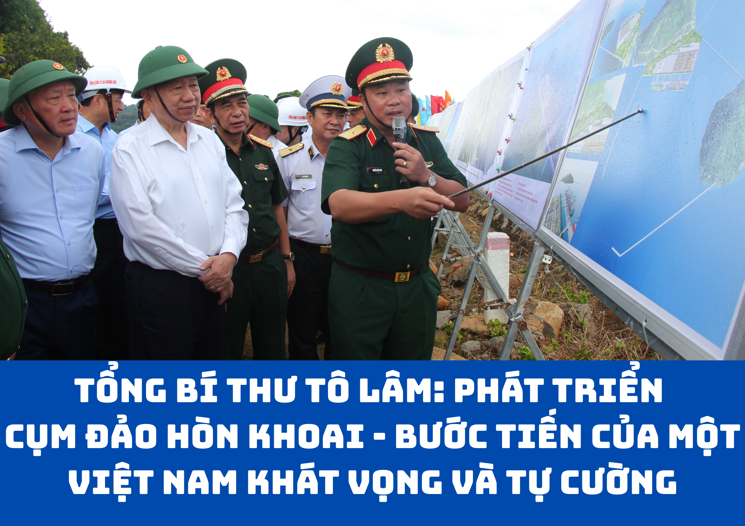 Tổng Bí thư nhấn mạnh, Hòn Khoai không chỉ là một công trình - đó là lời thề của quốc gia, là bước tiến của một Việt Nam khát vọng và tự cường. Trước mắt là nhiệm vụ lớn, thời gian gấp, điều kiện khắc nghiệt nhưng tinh thần Việt Nam chưa bao giờ khuất phục: khó khăn chỉ là phép thử, sóng gió chỉ là cửa ải, ý chí mới là sức mạnh quyết định. Tổng Bí thư đề nghị các tất cả các chiến sĩ bộ đội phát huy mạnh mẽ tinh thần bộ đội Cụ Hồ quyết tâm hoàn thành vượt mức kế hoạch đề ra. Mỗi cán bộ, chiến sĩ, công nhân trên đảo hãy khắc sâu điều này: Mỗi nhịp cầu, mỗi cọc biển là một dấu son của Tổ quốc. Gian khó không được chùn chân. Biển sâu, sóng cao không cản được ý chí quyết tâm. Càng khó khăn, càng quyết tâm. Bởi chúng ta đang dựng nên không chỉ một cảng biển, mà là thế đứng của đất nước trên biển lớn; không chỉ mở đường ra đảo mà đang mở đường cho tương lai Việt Nam.