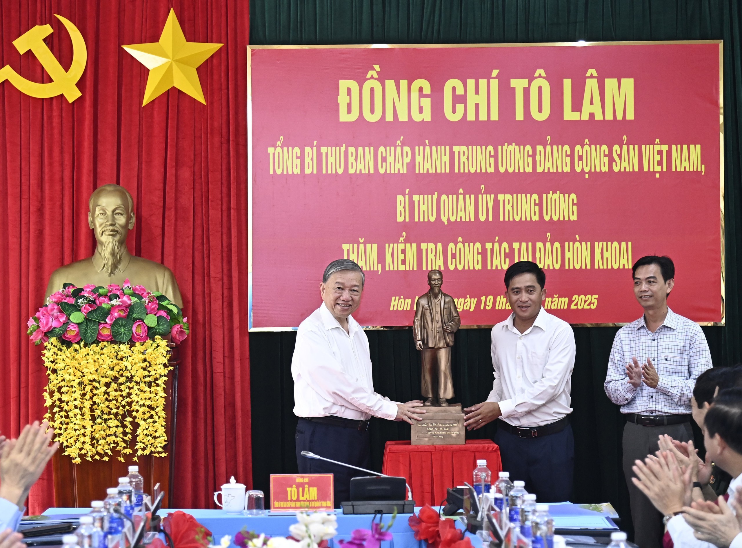 Tổng Bí thư Tô Lâm tặng quà các đơn vị thi công dự án trên đảo Hòn Khoai. Ảnh: Chanh Đa-TTXVN .