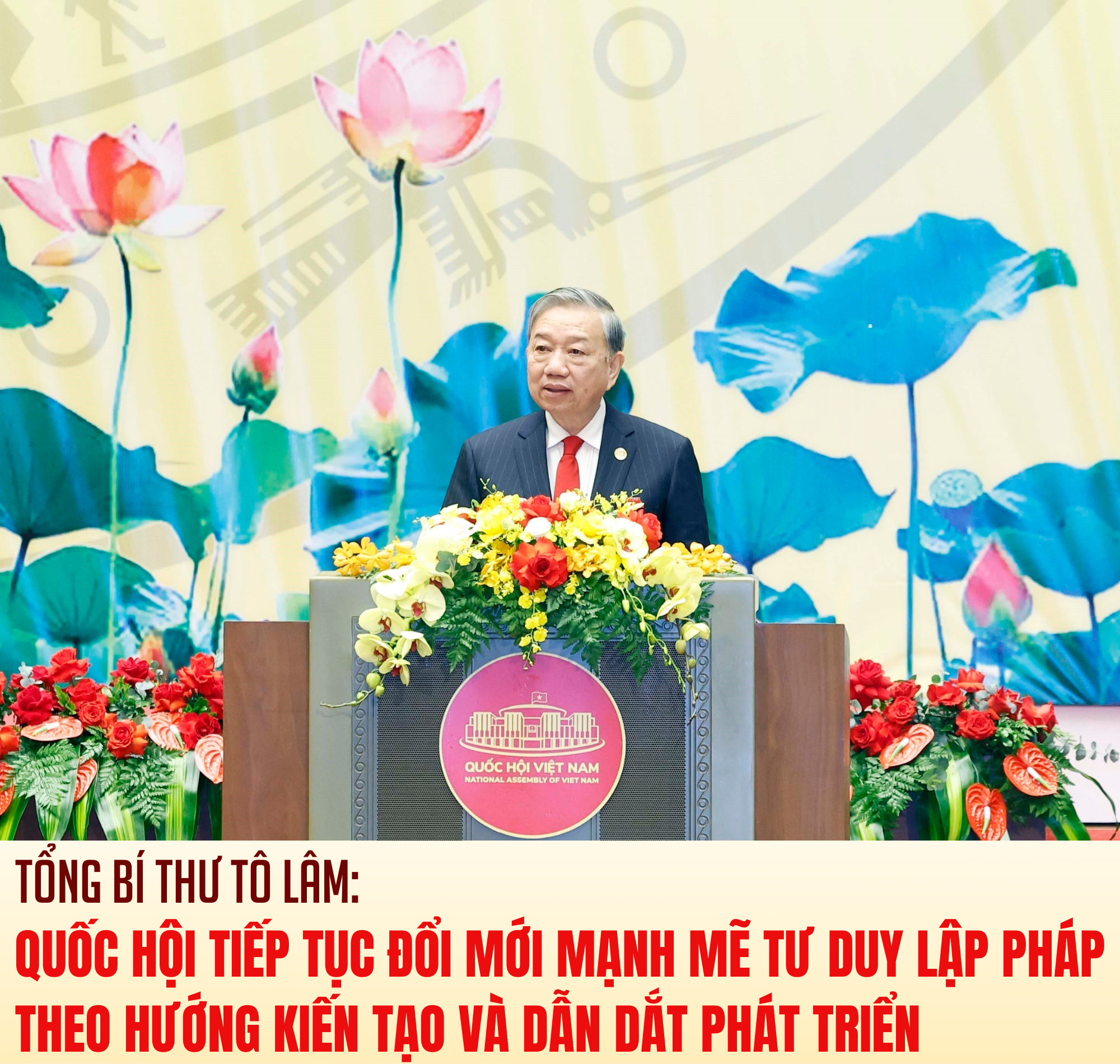 Tổng Bí thư khẳng định, Quốc hội ngày càng thể hiện rõ vai trò đi trước một bước về thể chế, chủ động thể chế hóa kịp thời chủ trương, đường lối của Đảng thành pháp luật; đẩy mạnh đổi mới tư duy lập pháp theo hướng kiến tạo phát triển; ứng dụng mạnh mẽ công nghệ số, chuyển đổi số, trí tuệ nhân tạo trong hoạt động xây dựng pháp luật, góp phần hình thành khuôn khổ pháp lý đồng bộ, minh bạch, ổn định cho phát triển đất nước.