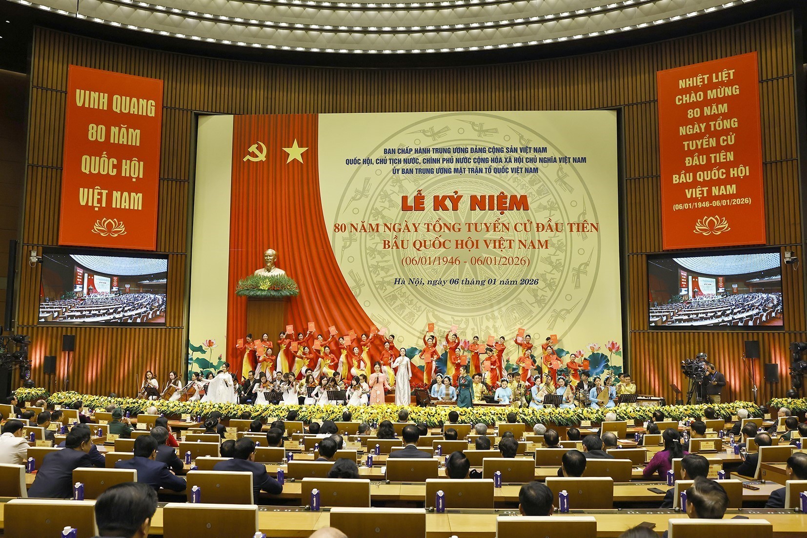 Sáng 6/1, tại Nhà Quốc hội, Ban Chấp hành Trung ương Đảng Cộng sản Việt Nam, Quốc hội, Chủ tịch nước, Chính phủ nước Cộng hòa xã hội chủ nghĩa Việt Nam và Ủy ban Trung ương Mặt trận Tổ quốc Việt Nam tổ chức trọng thể Lễ kỷ niệm cấp quốc gia 80 năm Ngày Tổng tuyển cử đầu tiên bầu Quốc hội Việt Nam (6/1/1946 - 6/1/2026).