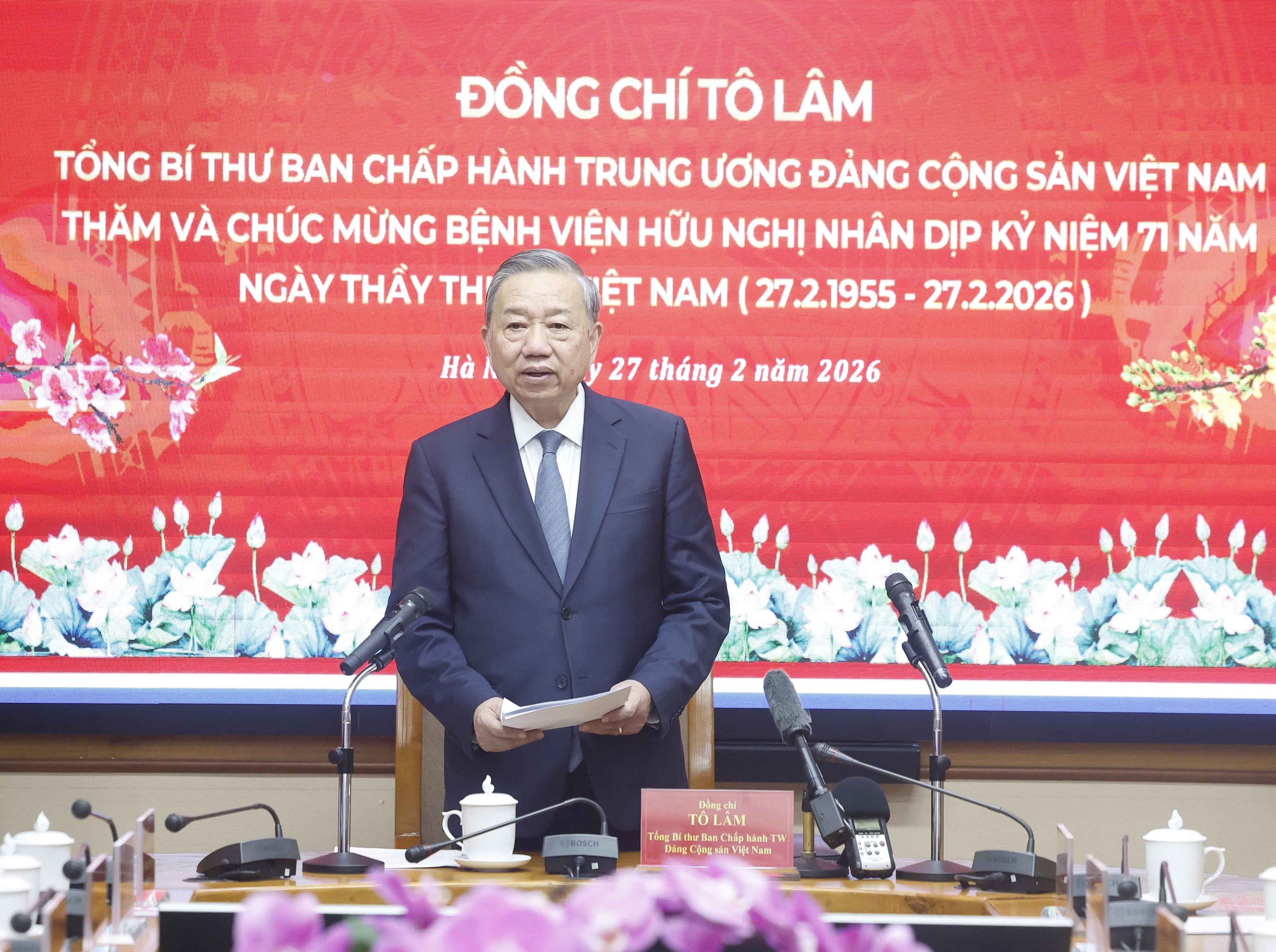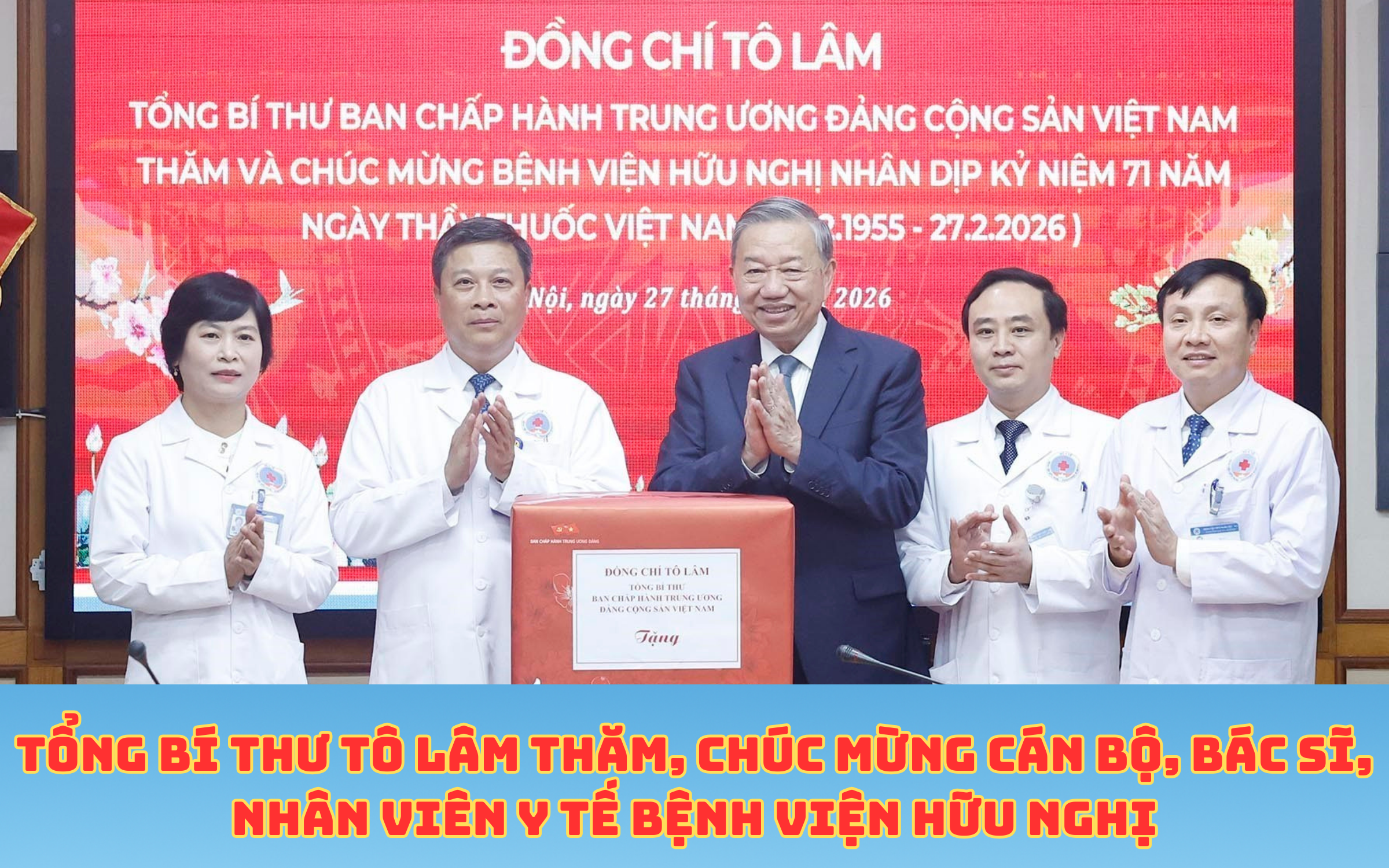 Nhân dịp kỷ niệm 71 năm Ngày Thầy thuốc Việt Nam (27/2/1955 – 27/2/2026), chiều 27/2/2026, tại Hà Nội, Tổng Bí thư Tô Lâm đến thăm, chúc mừng cán bộ, nhân viên y tế Bệnh viện Hữu nghị.